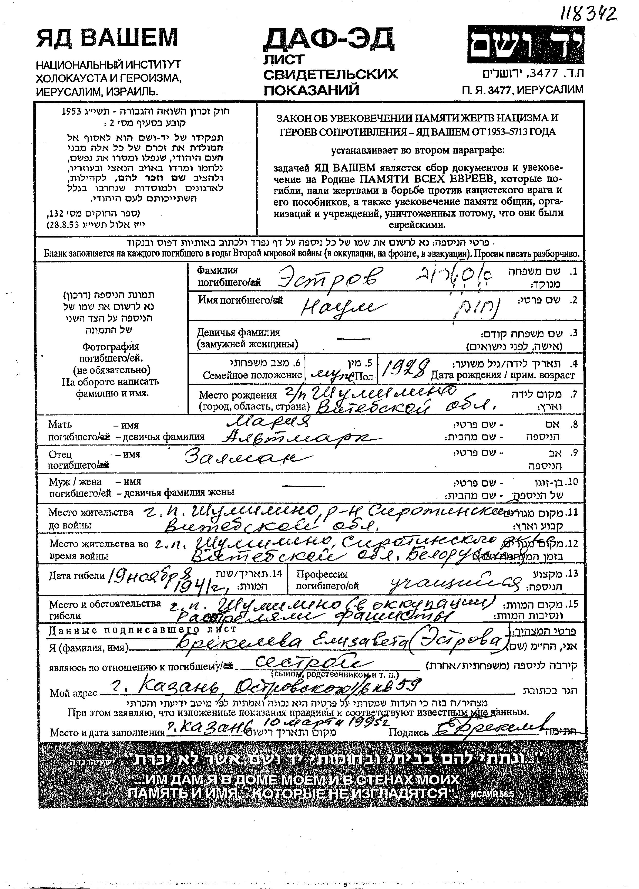 Estrov Astrov Nakhum 1928 Shumilino, Bélorussie (URSS) Feuille de témoignage