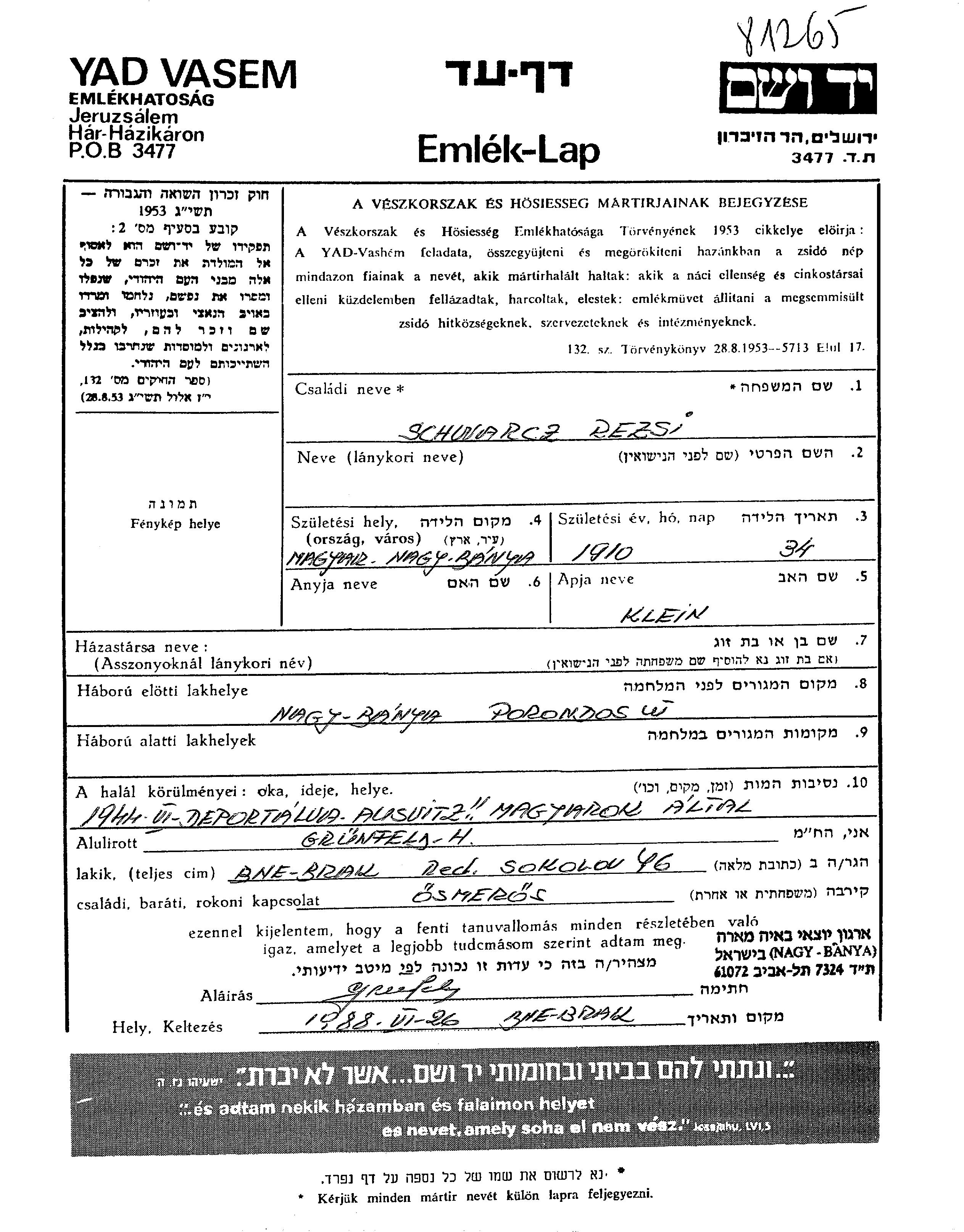 Schwartz Rezsi 1910 Nagybánya, Roumanie Feuille de témoignage