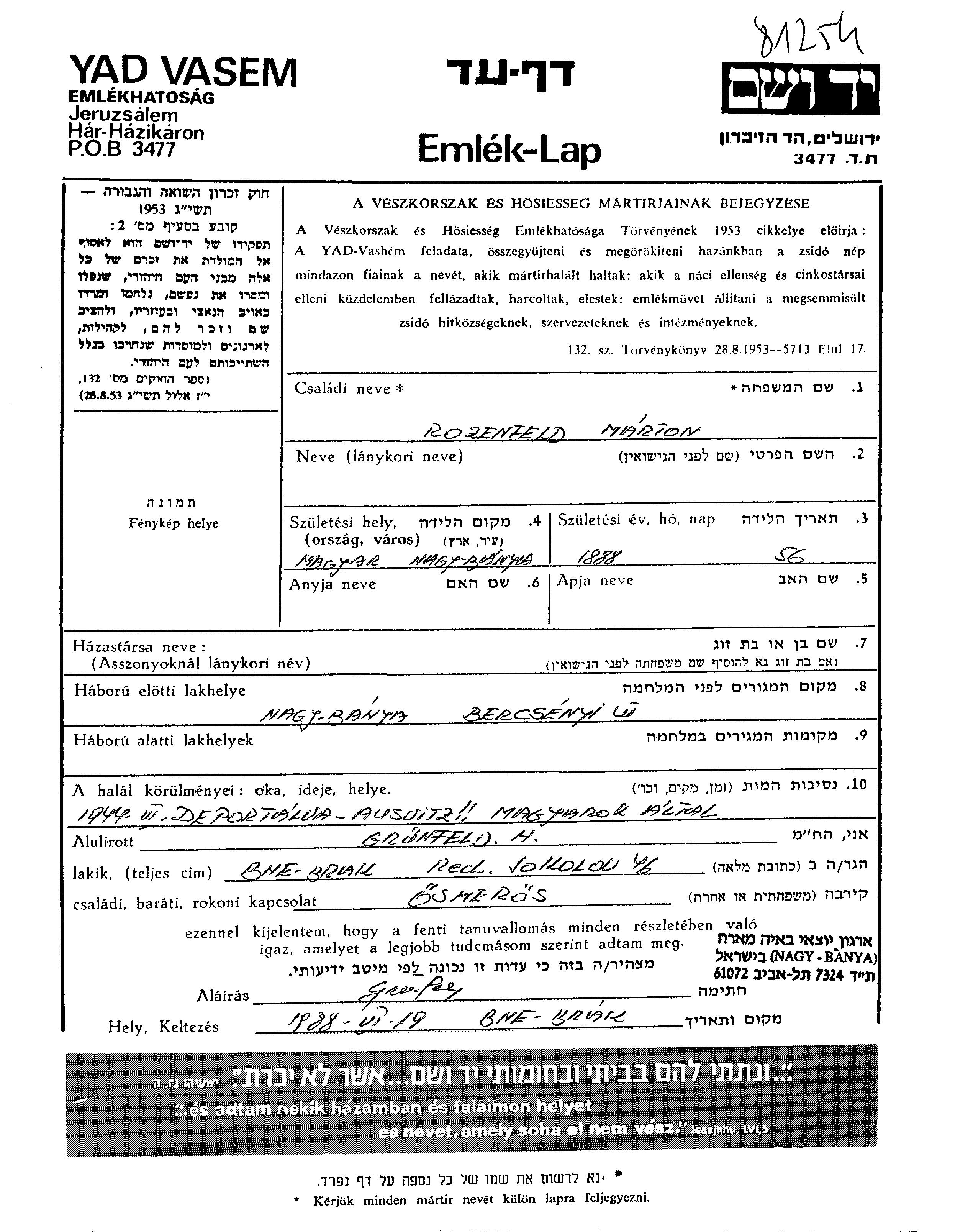 Rosenfeld Marton 1888 Nagybánya, Roumanie Feuille de témoignage
