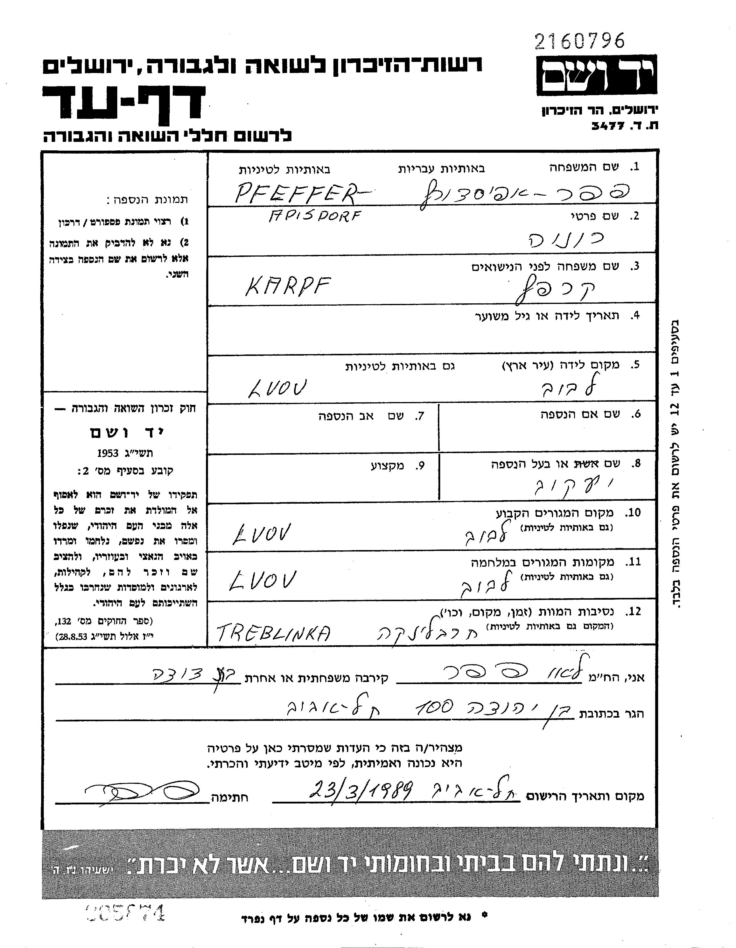 Yad Vashem - Pages of Testimony Names Memorial Collection