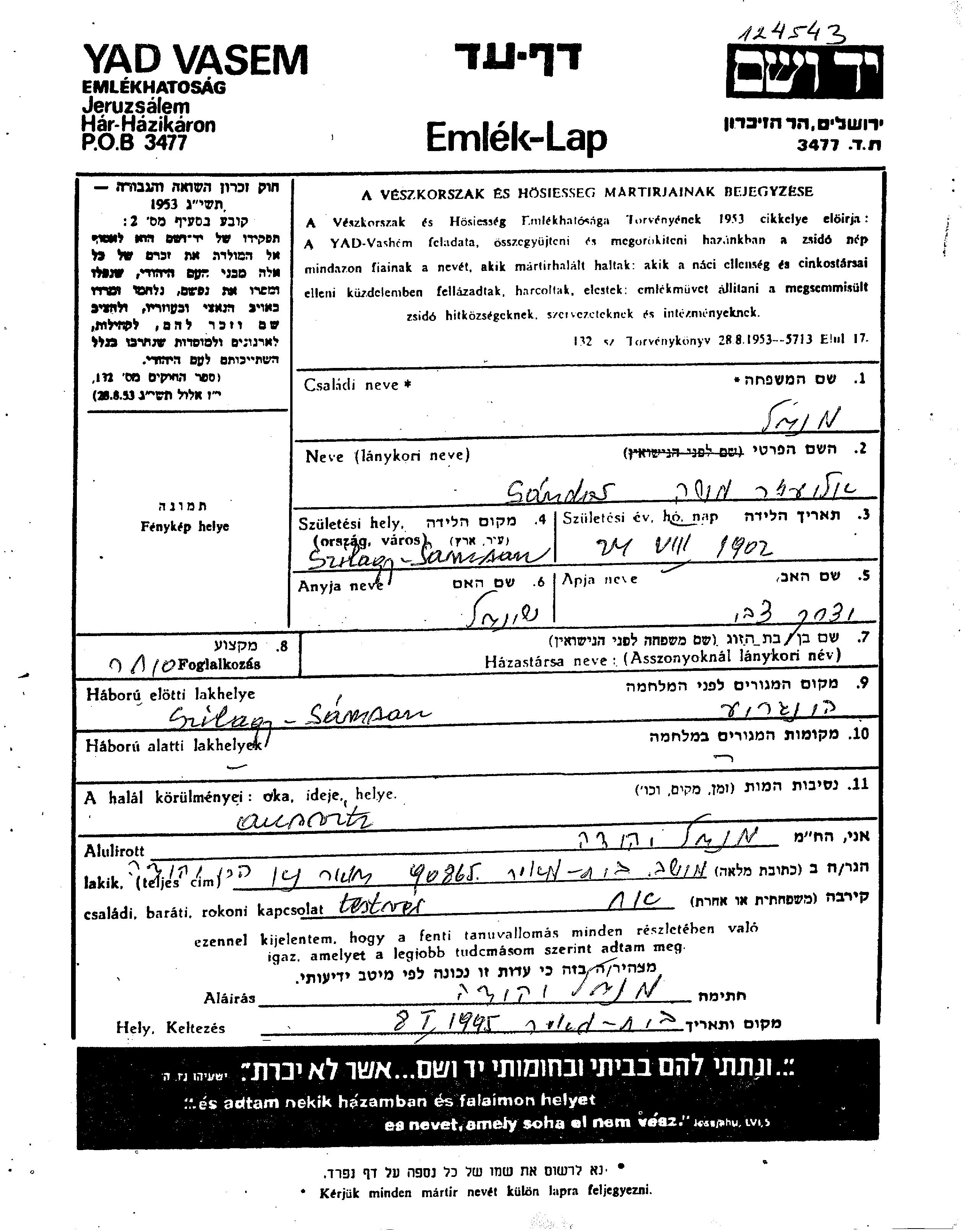Mendel Sandor Eliezer Moshe 1902 Szilagysamson, Roumanie Feuille de témoignage