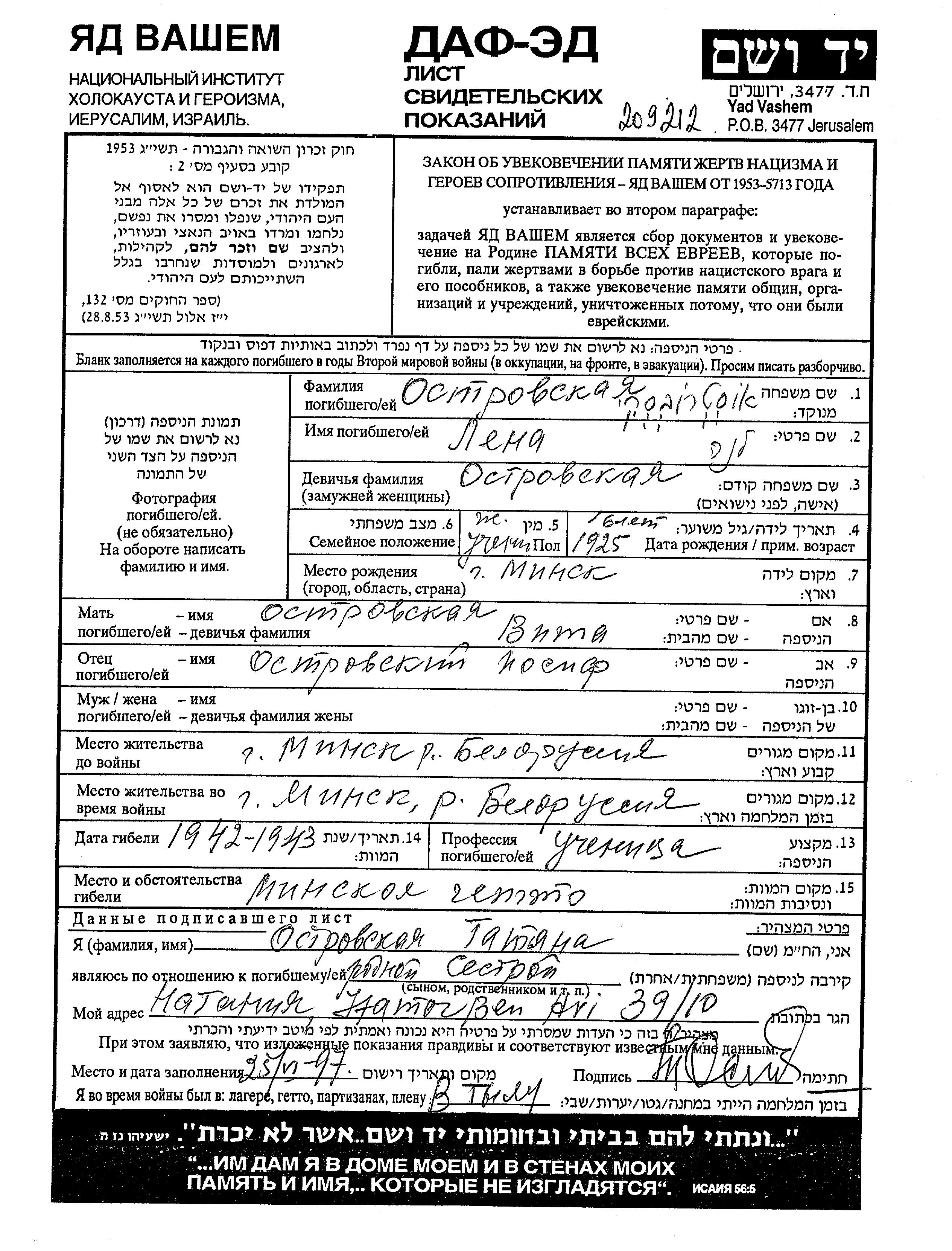 Ostrovski Lena 1925 Minsk, Bélorussie (URSS) Feuille de témoignage