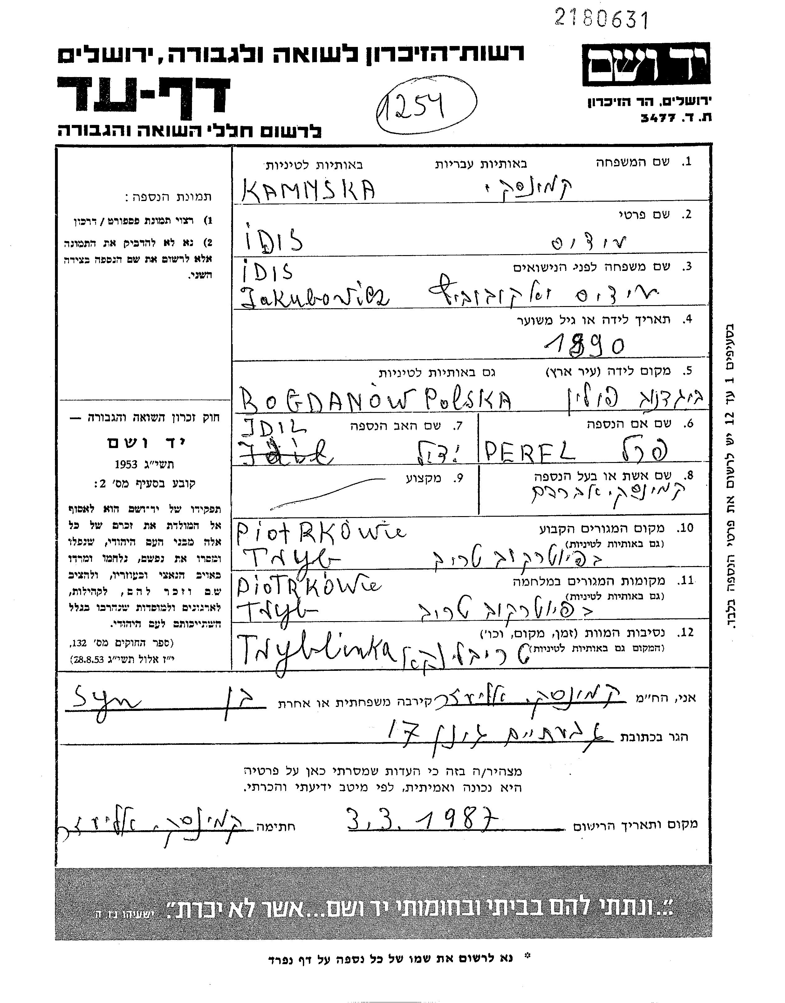 Kaminski Yehudit 1890 Piotrkow Trybunalski, Pologne Feuille de témoignage
