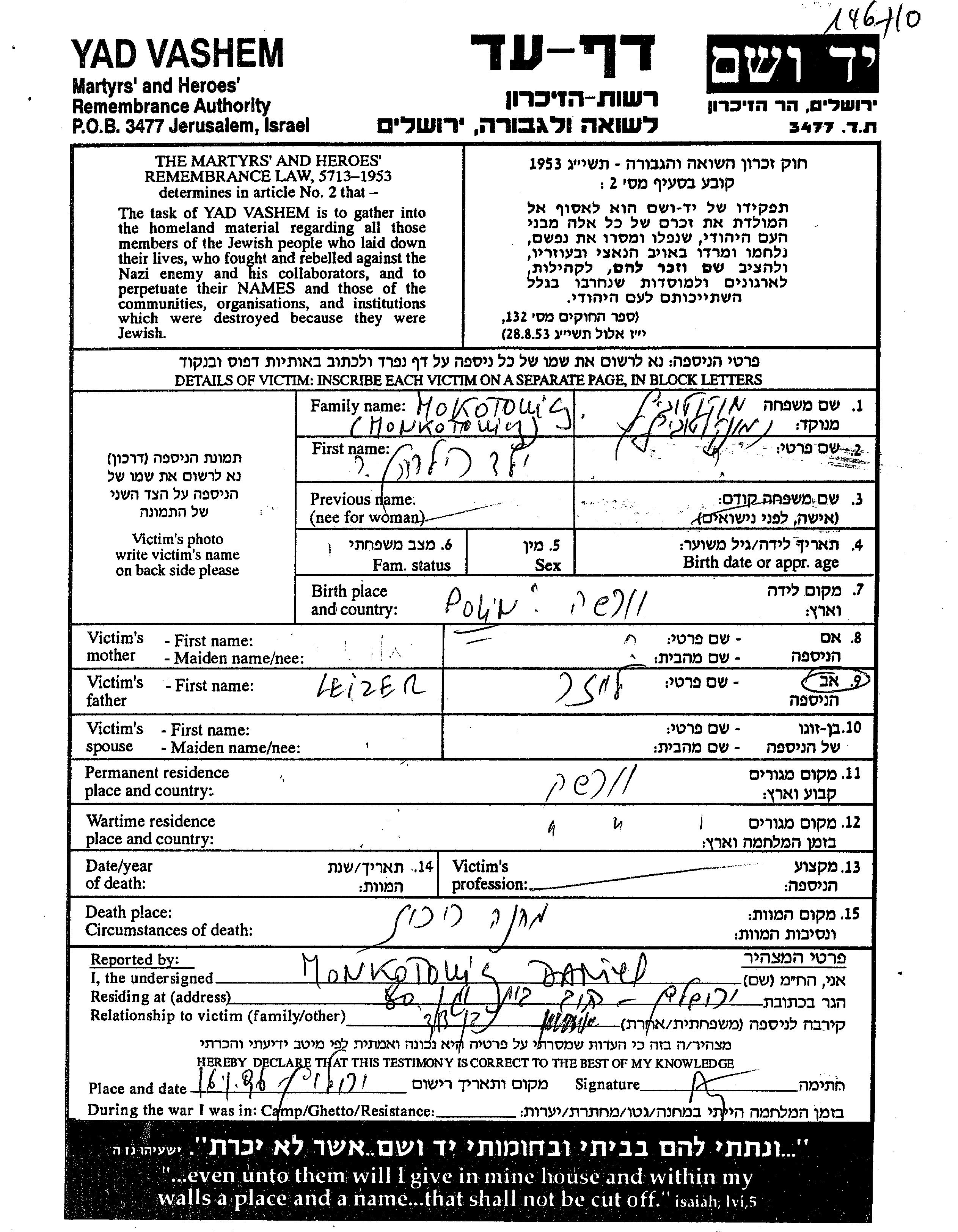 Yad Vashem - Pages of Testimony Names Memorial Collection