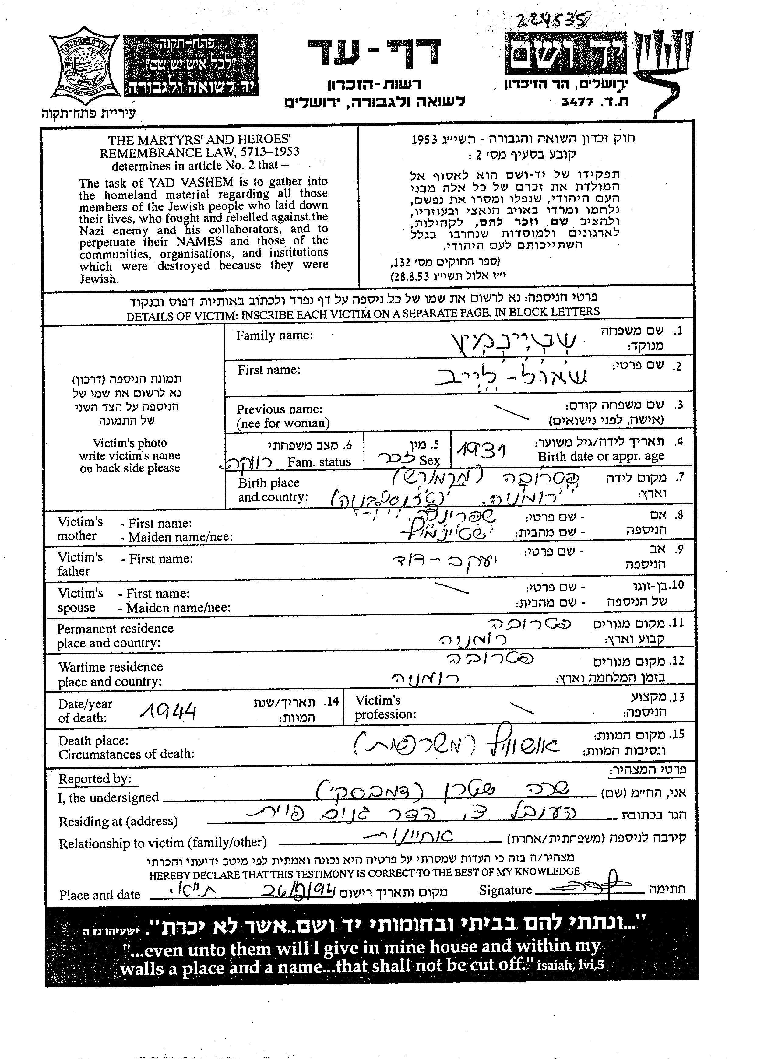 Shteinmetz Shaul Leib 1931 Petrova, Roumanie Feuille de témoignage