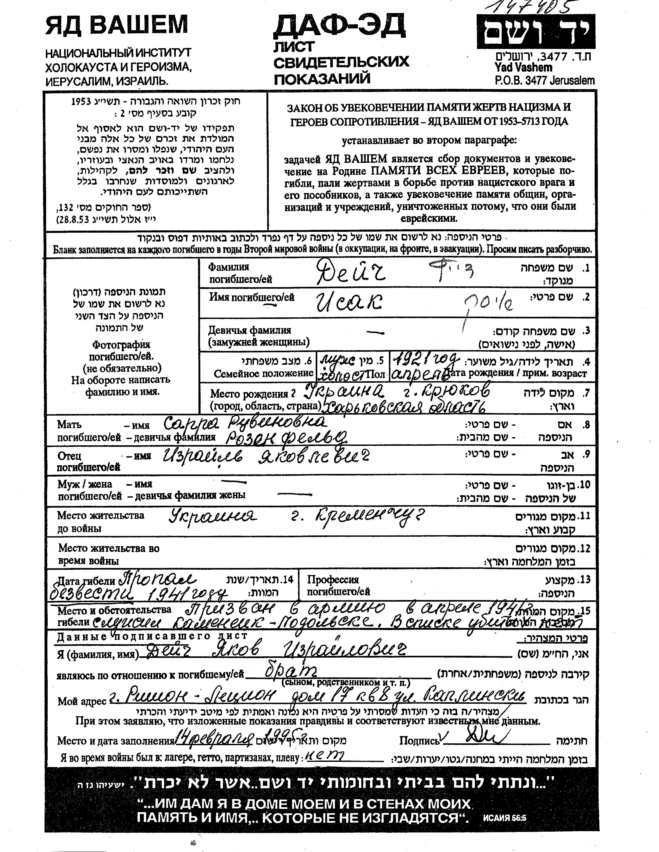 Deutsch Isak 1921 Kremenchug, Ukraine (URSS) Feuille de témoignage