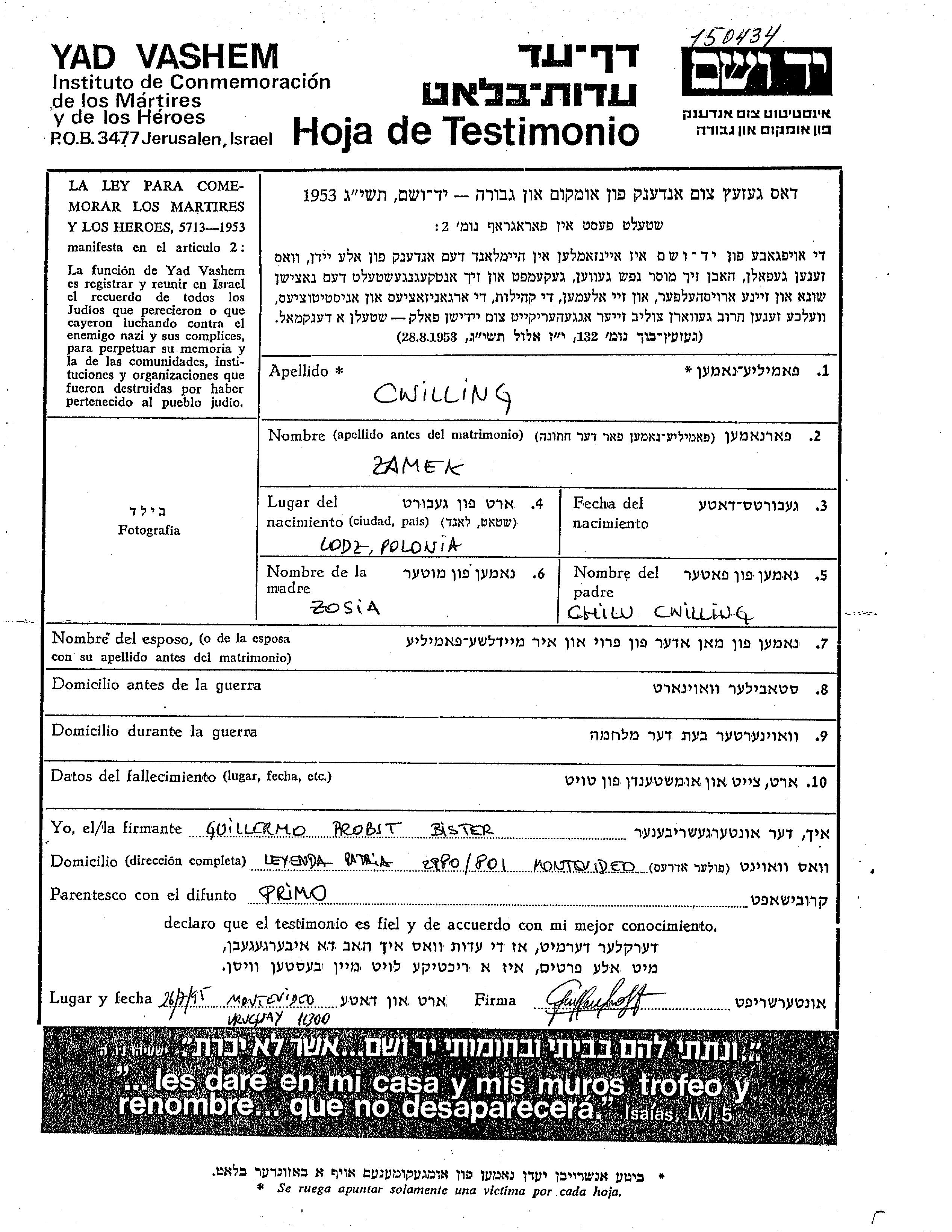 Cwilling Zamek endroit inconnu, Feuille de témoignage