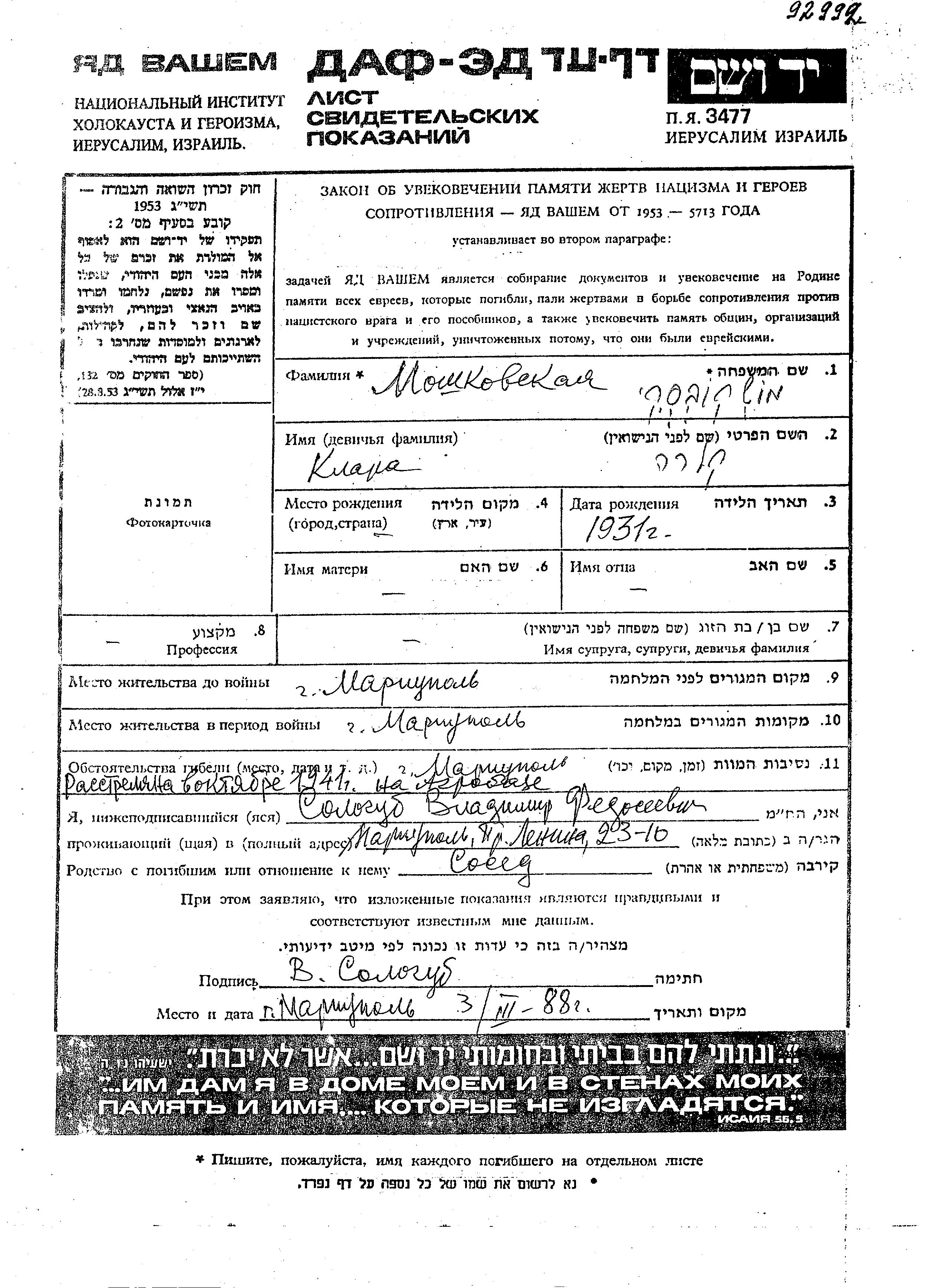 Moshkovski Klara 1931 Mariupol, Ukraine (URSS) Feuille de témoignage