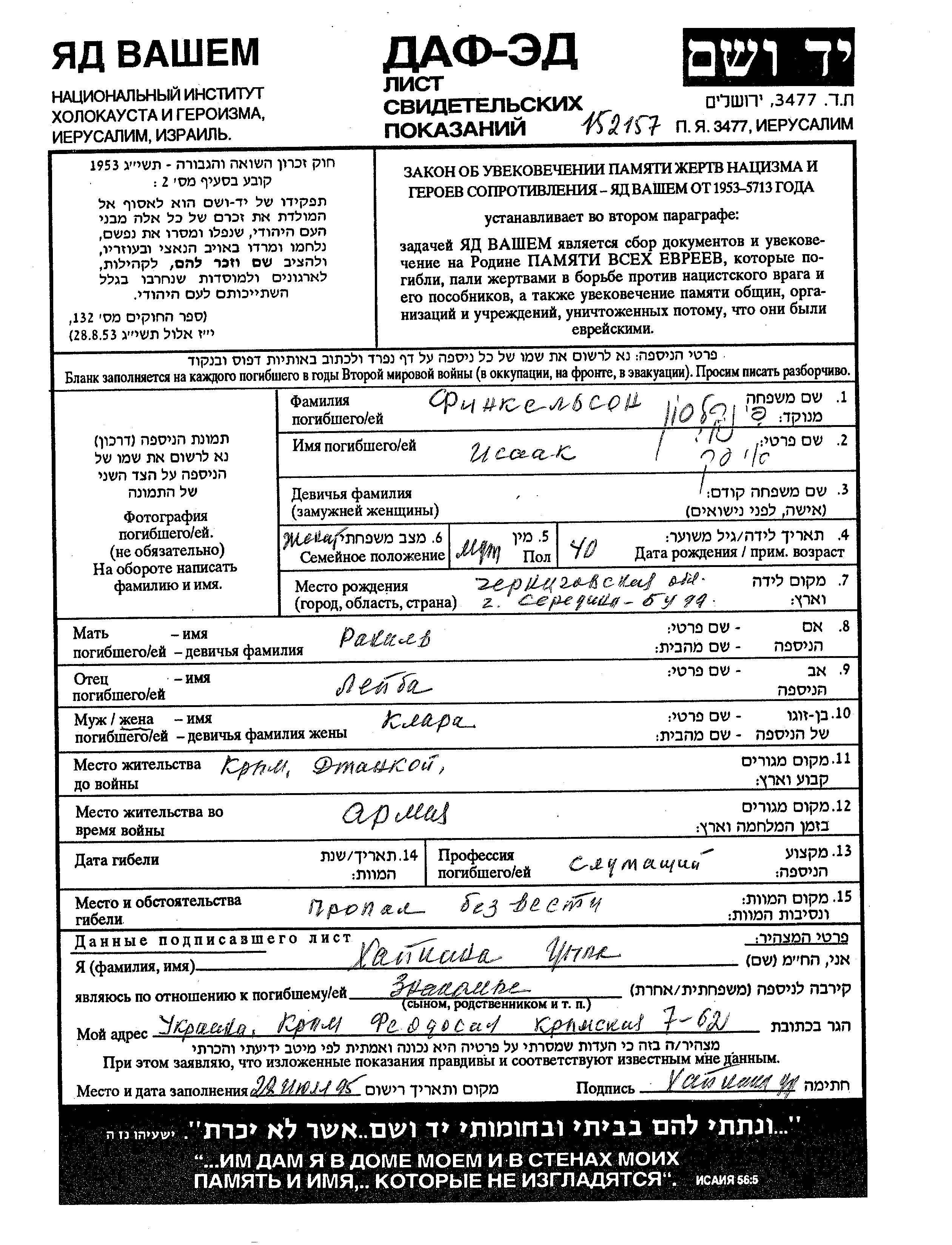 Finkelson Isaak Dzhankoy, Russie (URSS) Feuille de témoignage