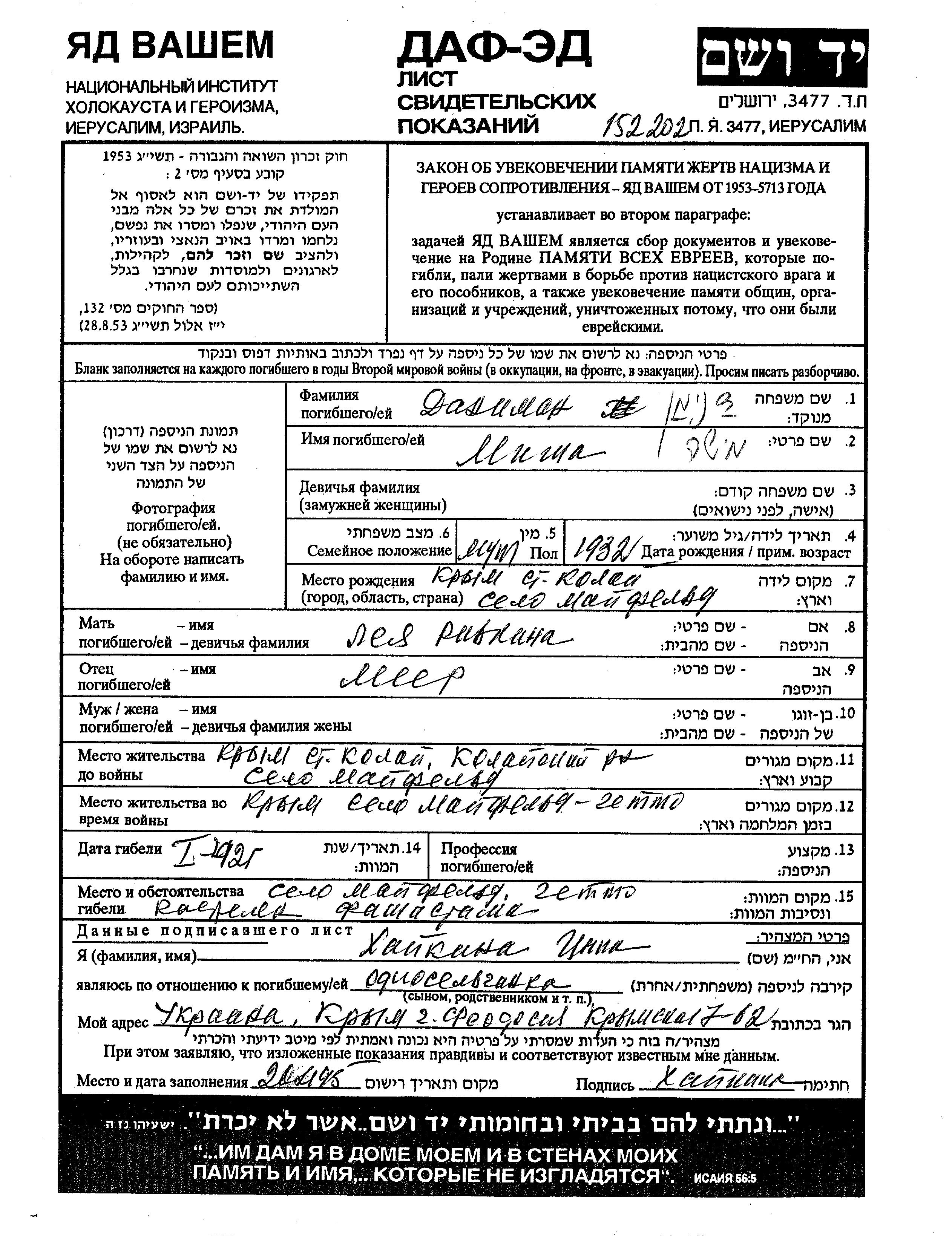 Daniman Misha 1932 Mayfeld, Russie (URSS) Feuille de témoignage