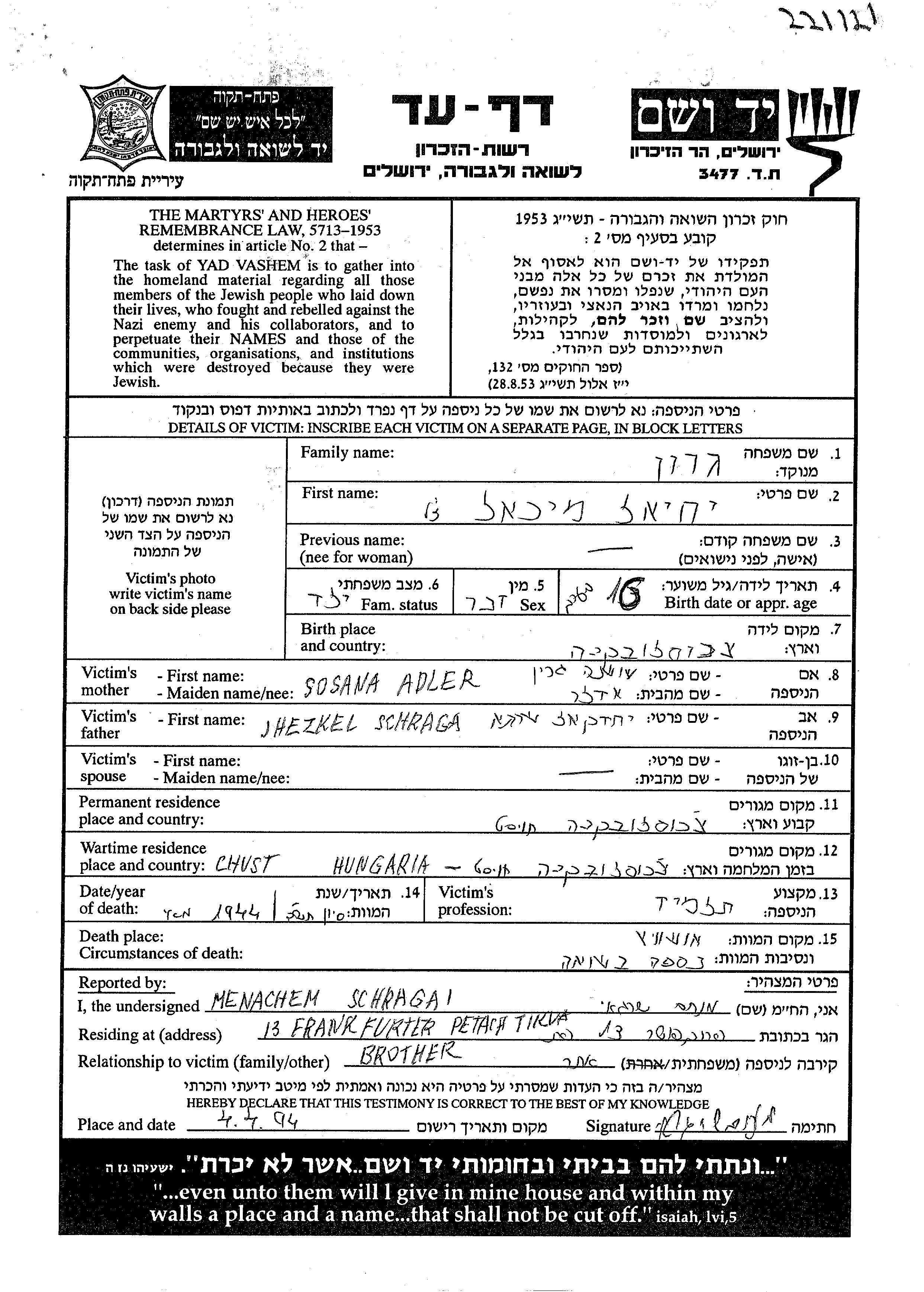 Grun Yekhiel Mikhael 1928 Chust, Tchécoslovaquie Feuille de témoignage