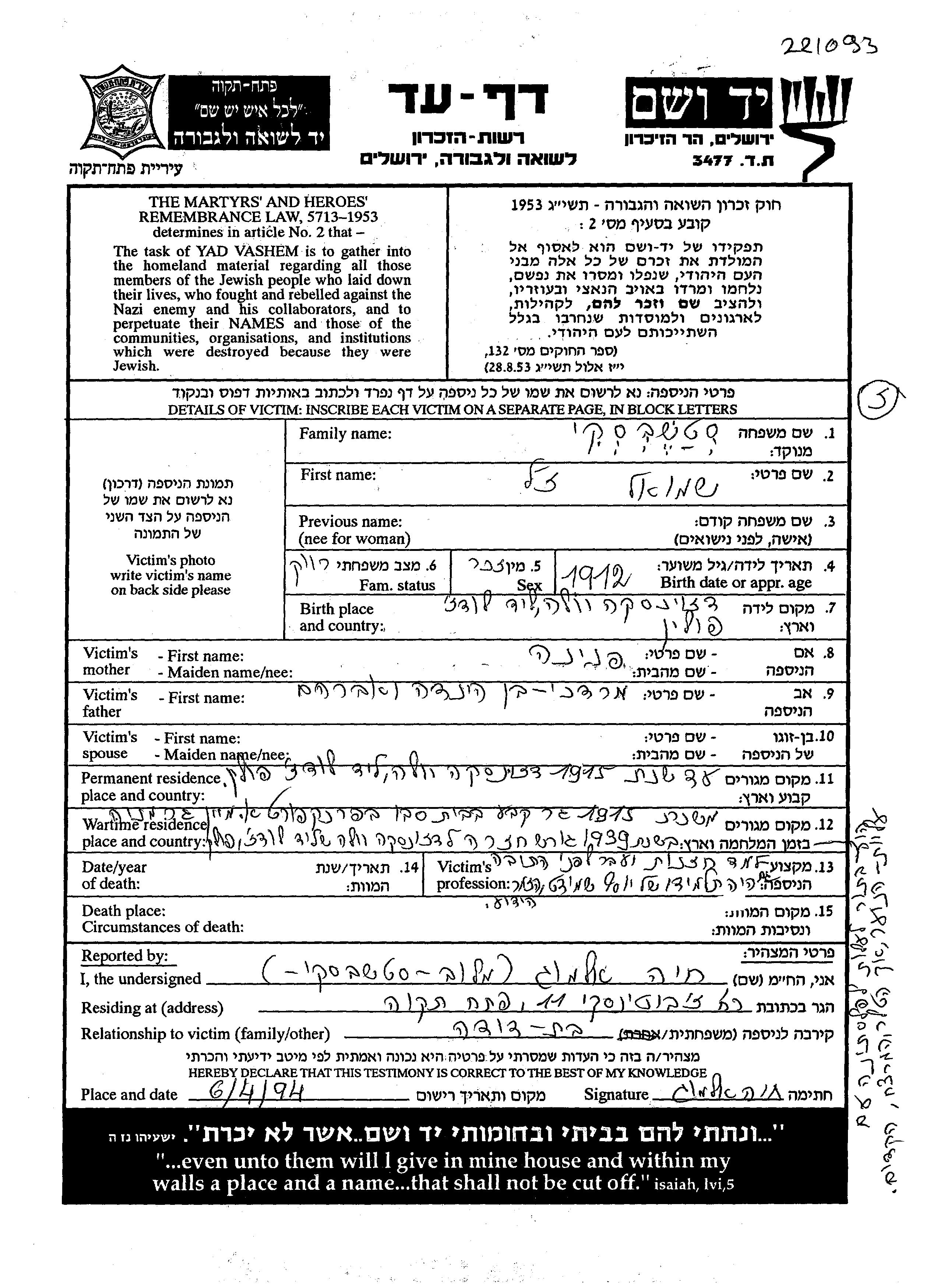 Yad Vashem - Pages of Testimony Names Memorial Collection