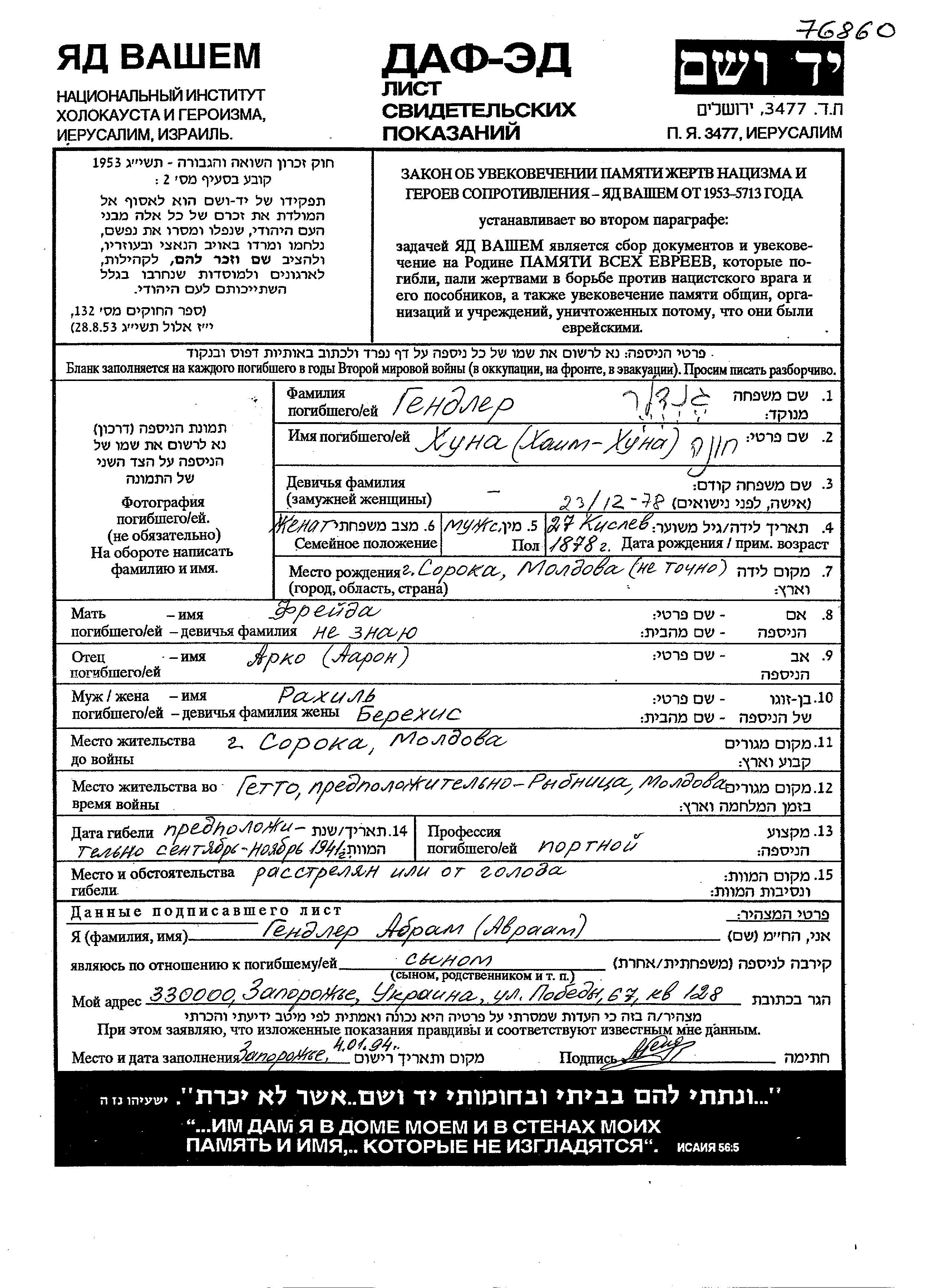 Khuna Khaim Gendler Gandler est né à Soroca, Roumanie en 1878, fils de Aaron et de Freida. Il était Tailleur et Mariée à Rakhil. Avant la seconde guerre mondiale il vivait à Soroca, Roumanie. Au cours de la guerre, il était à Rybnitsa, Ukraine (URSS).