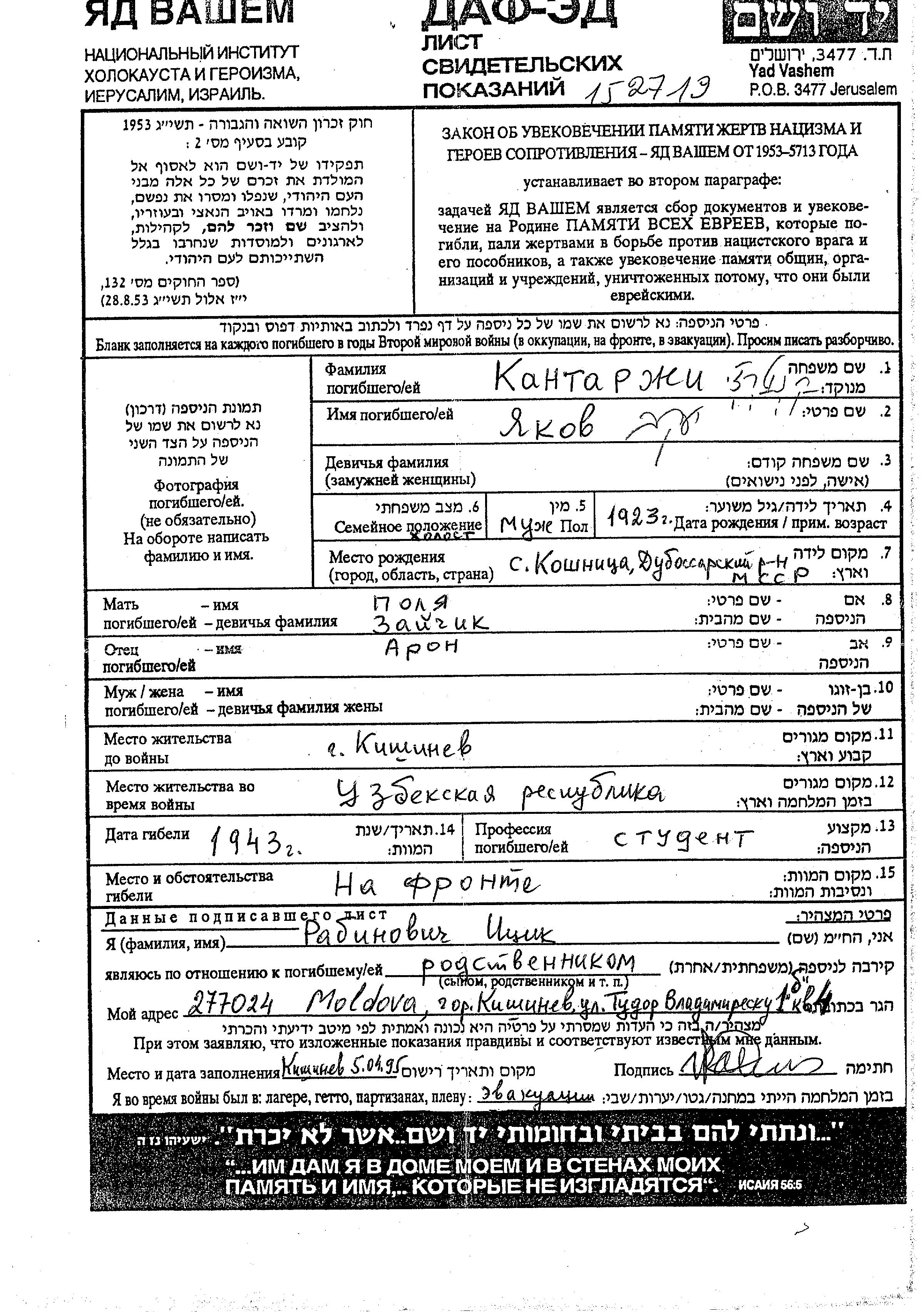 Yakov Kantarzhi est né à Cosauti, Roumanie en 1923, fils de Aron et de Polia née Zaychik. Il était Étudiant/e et Célibataire. Avant la seconde guerre mondiale il vivait à Kishinev, Roumanie. Au cours de la guerre, il était à Ouzbékistan (URSS). Yakov a été tué en tant que militaire pendant la Seconde Guerre mondiale. Lieu de la mort: endroit inconnu en 1943.