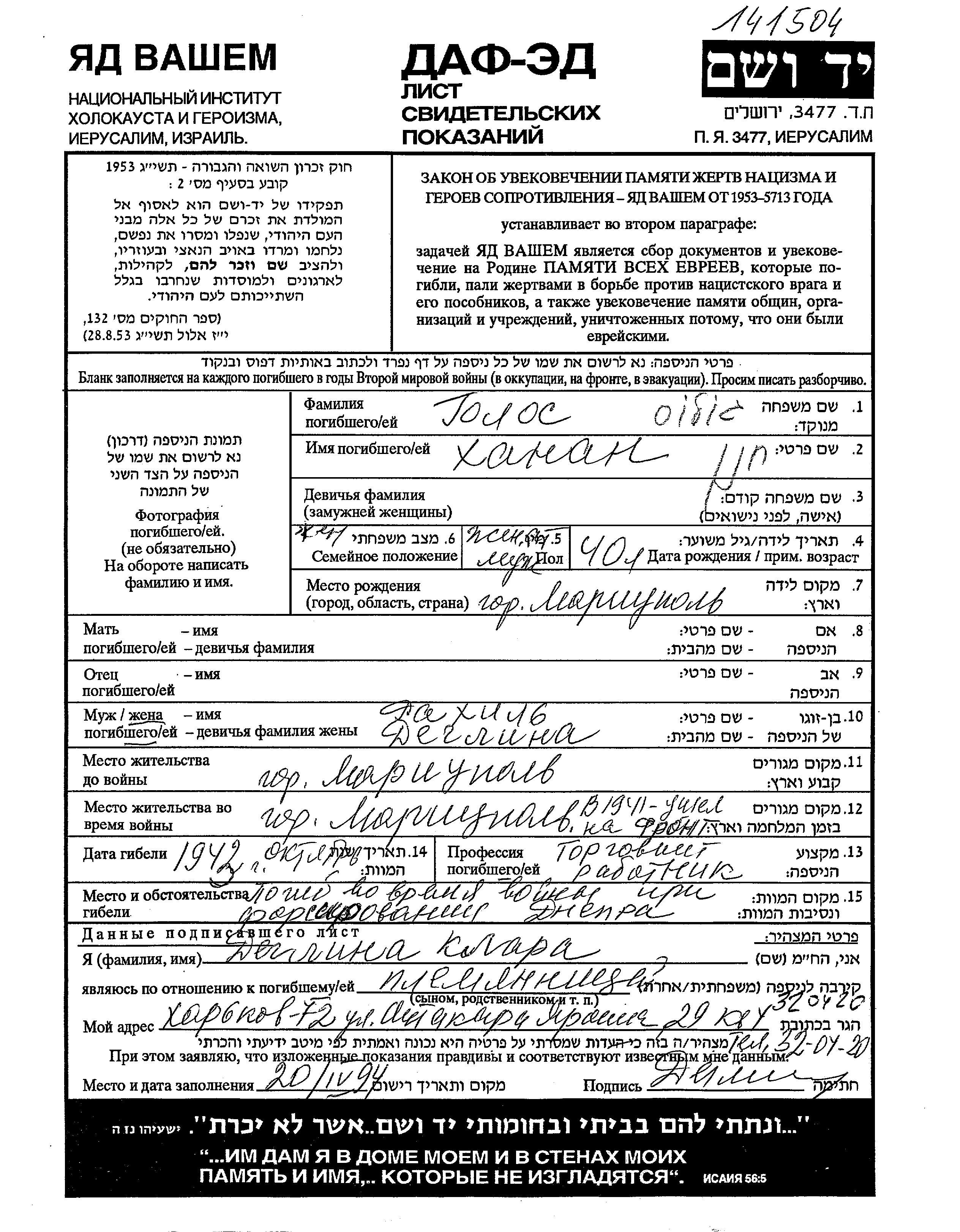 Khanan Golos est né à Mariupol, Ukraine (URSS) en 1903. Il était Vendeur/vendeuse et Mariée à Rakhil. Avant la seconde guerre mondiale il vivait à Mariupol, Ukraine (URSS). Au cours de la guerre, il était à the Soviet armed forces. Khanan a été tué en tant que militaire pendant la Seconde Guerre mondiale. Lieu de la mort: endroit inconnu en 1943.