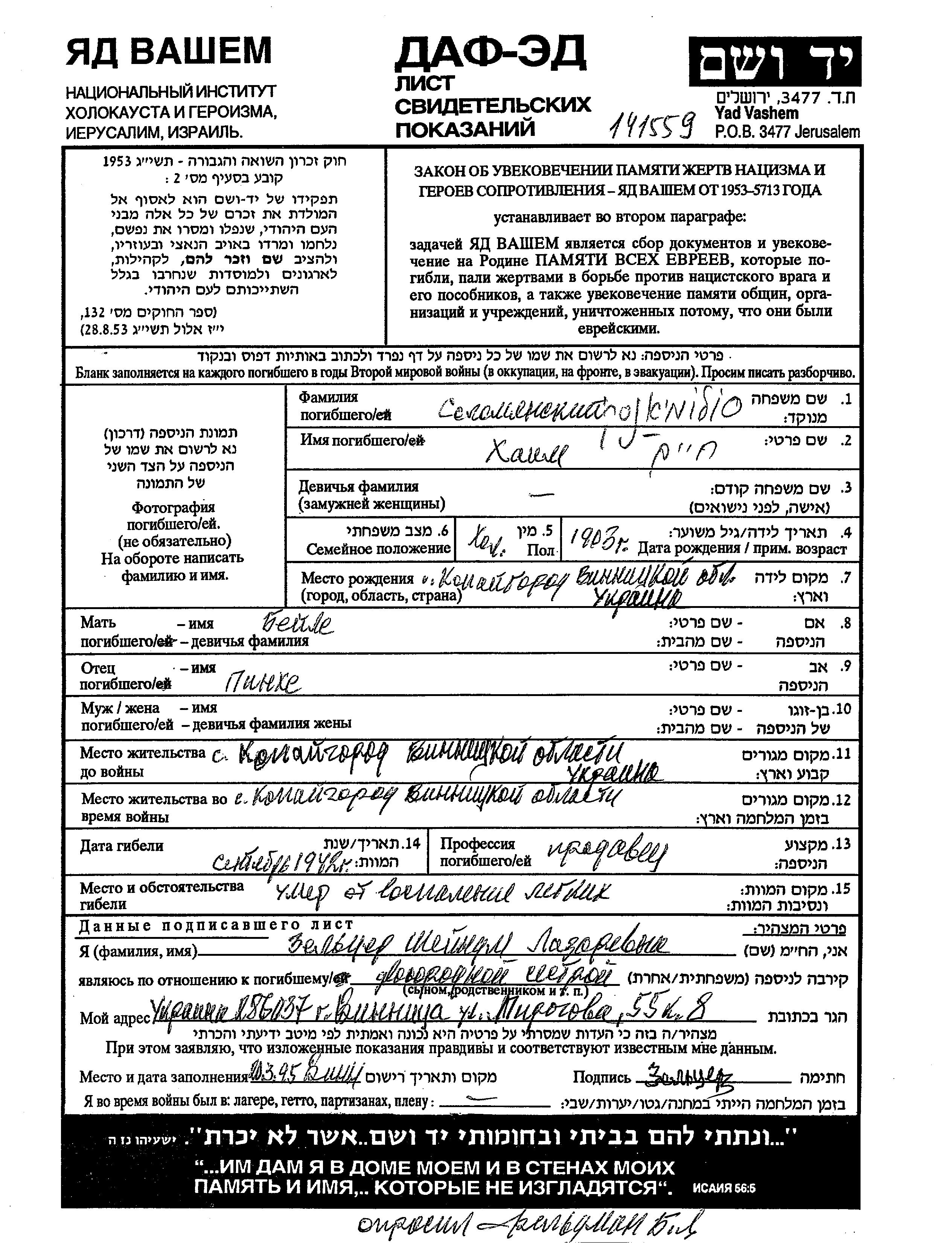 Solomyanski Khaim 1903 Kopaygorod, Ukraine (URSS) Feuille de témoignage