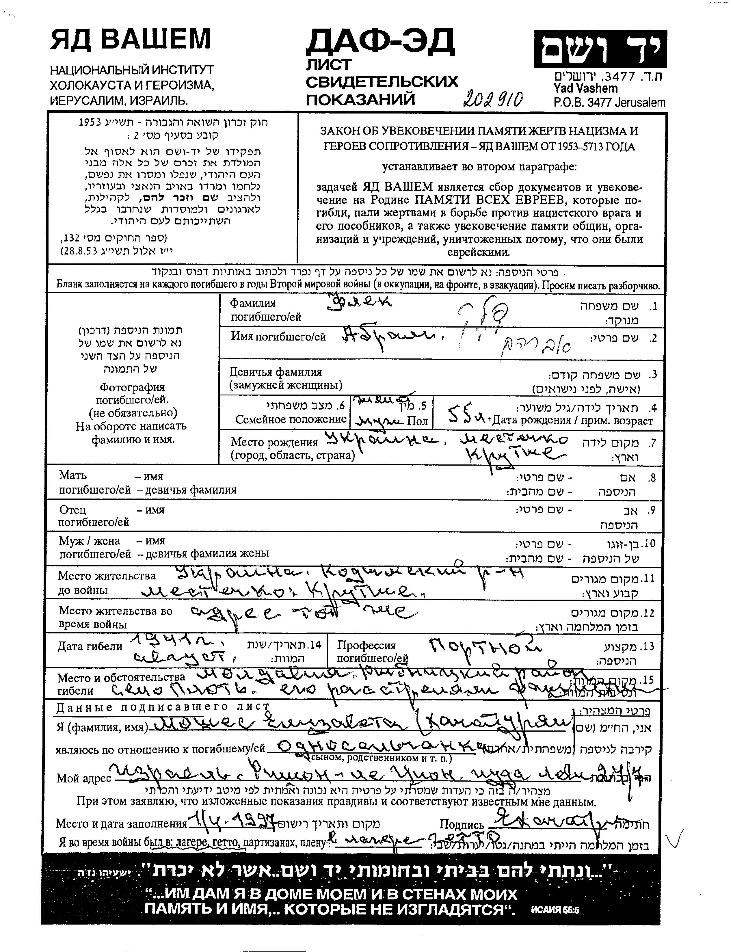 Abram a été assassiné pendant la Shoah. Lieu de la mort: Plot, Ukraine (URSS) en 1941.