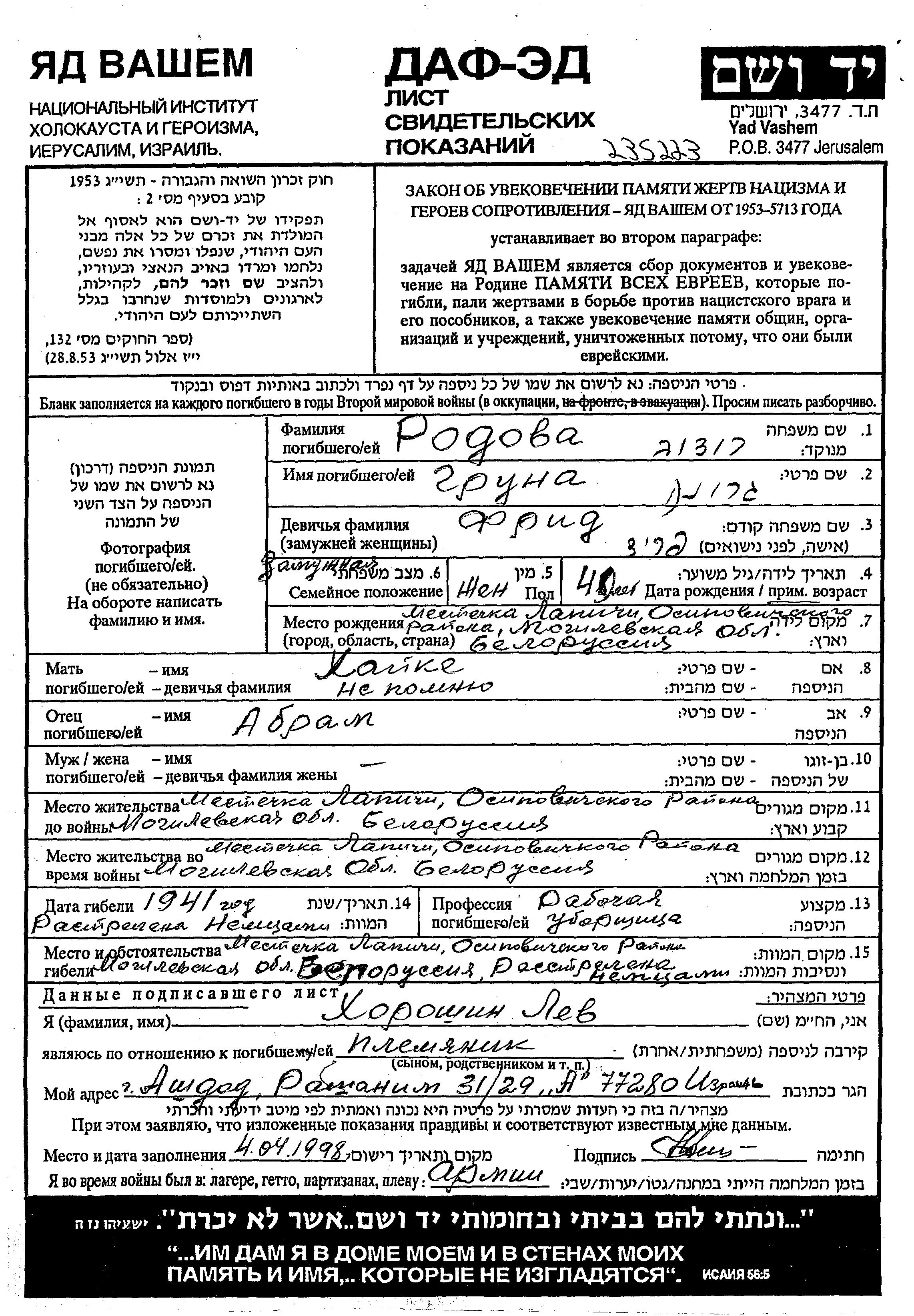 Rodov Rudov Gruna 1892 Lapichi, Bélorussie (URSS) Feuille de témoignage