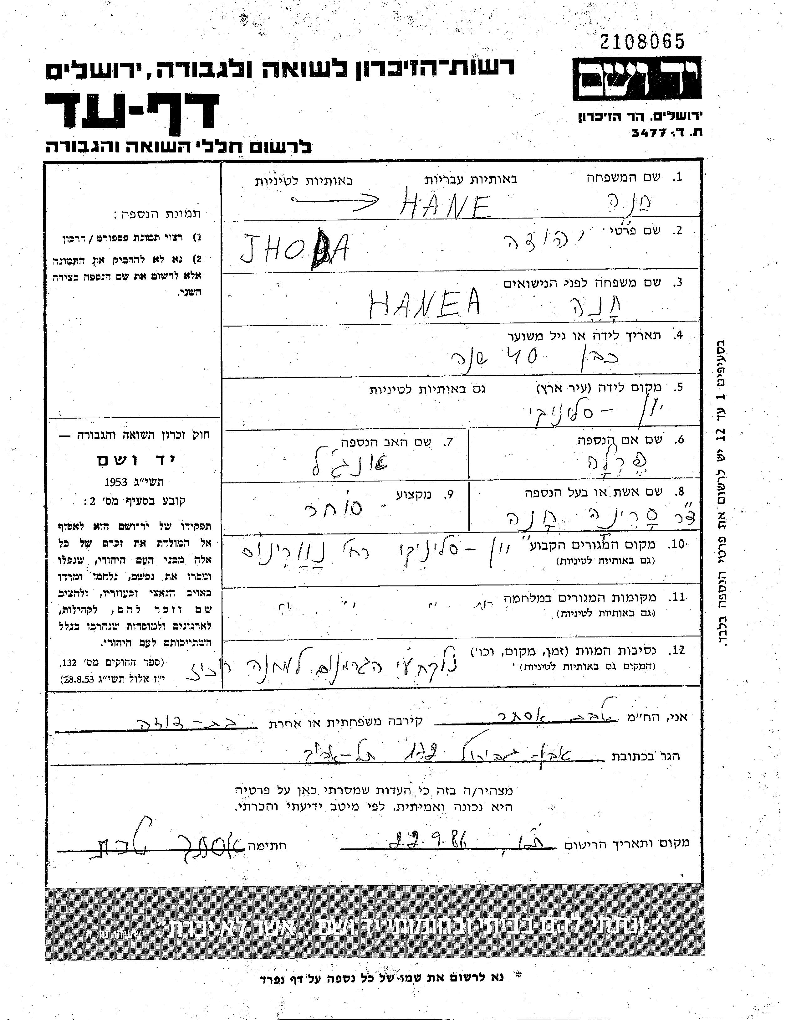 Hane Jhoda Saloniki, Grèce Feuille de témoignage