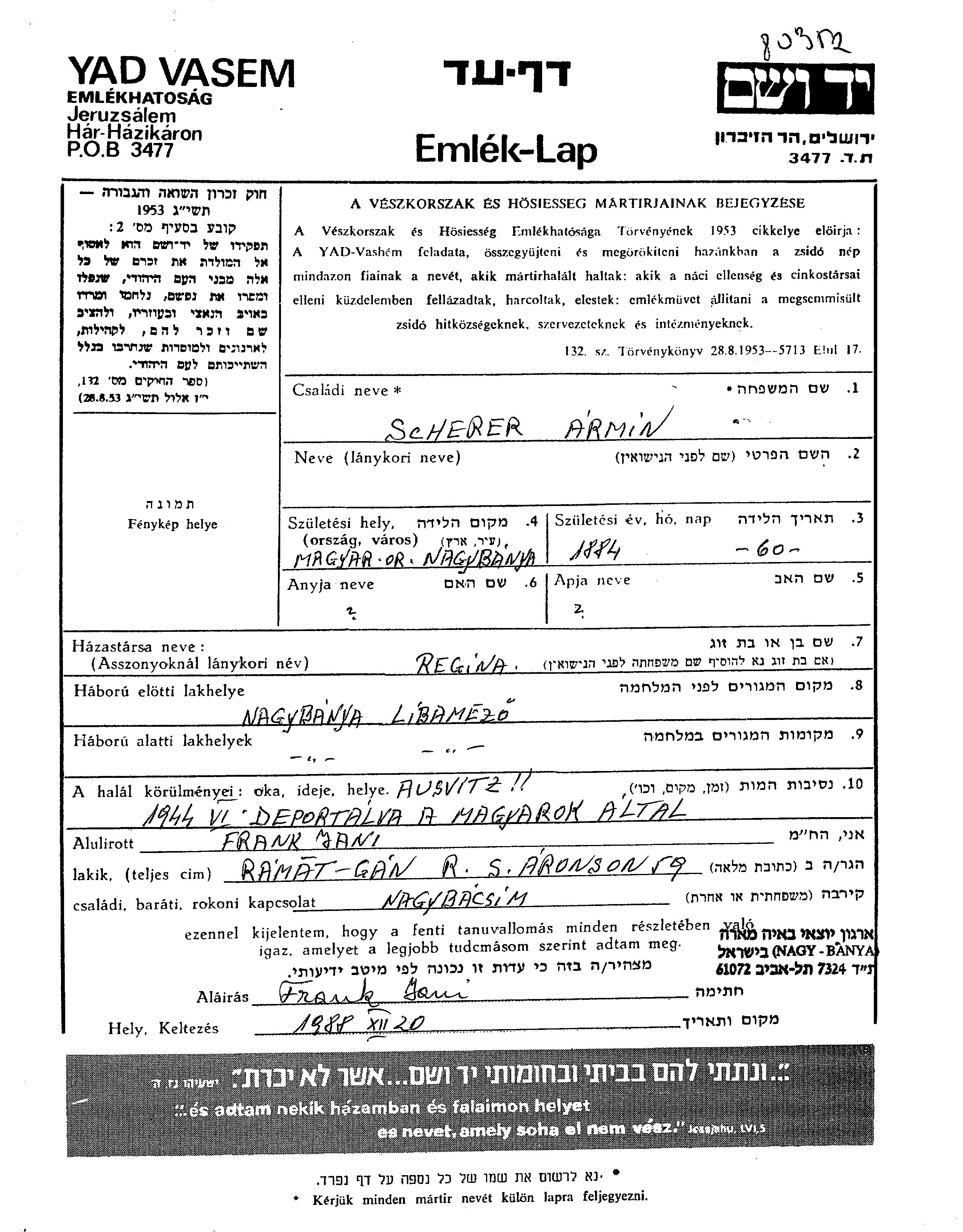 Armin Scherer est né à Nagybánya, Roumanie en 1884. Il était Mariée à Gruna Regina. Avant la seconde guerre mondiale il vivait à Nagybánya, Roumanie. Au cours de la guerre, il était à Nagybánya, Roumanie.