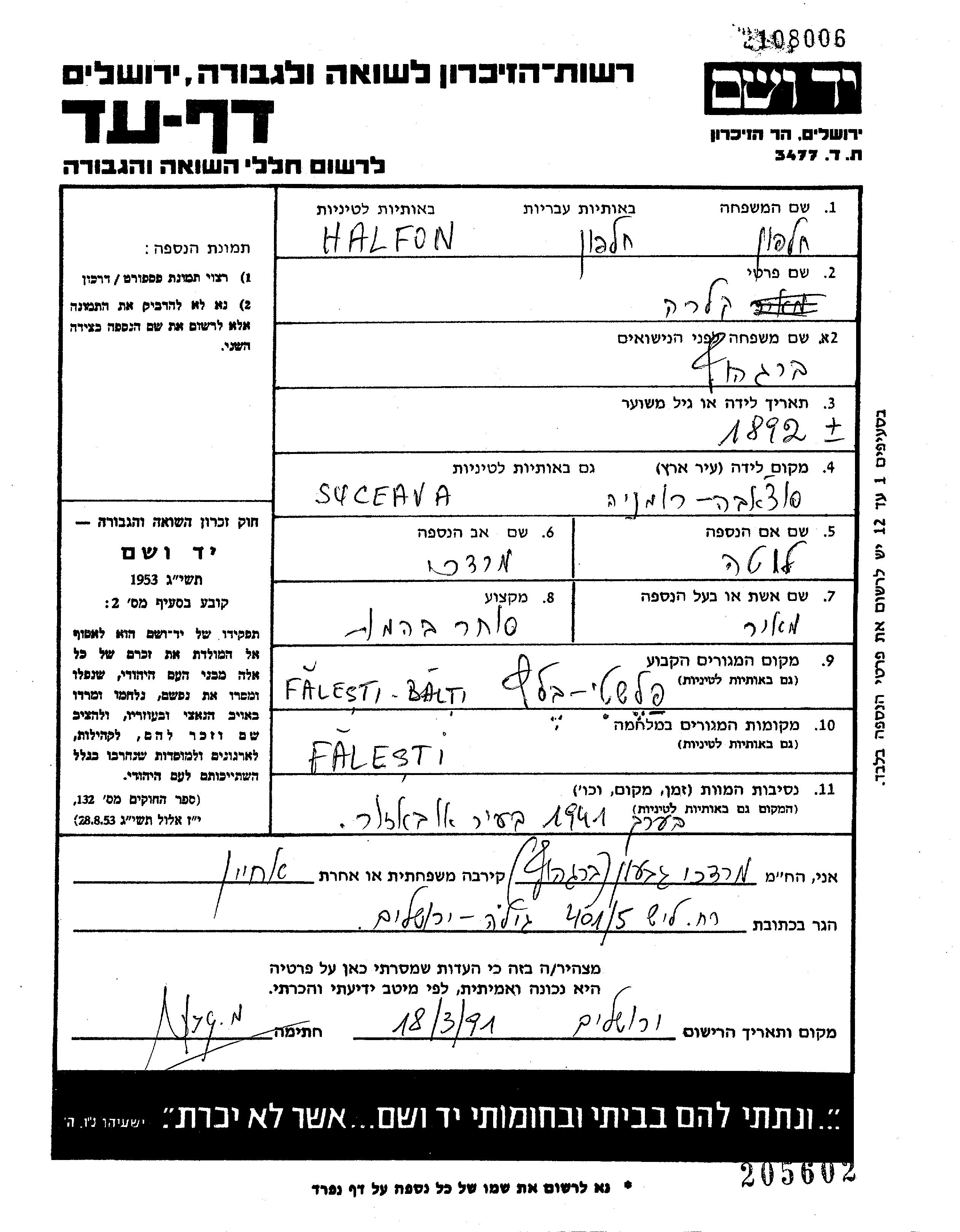 Halfon Klara Bălți, Roumanie Feuille de témoignage