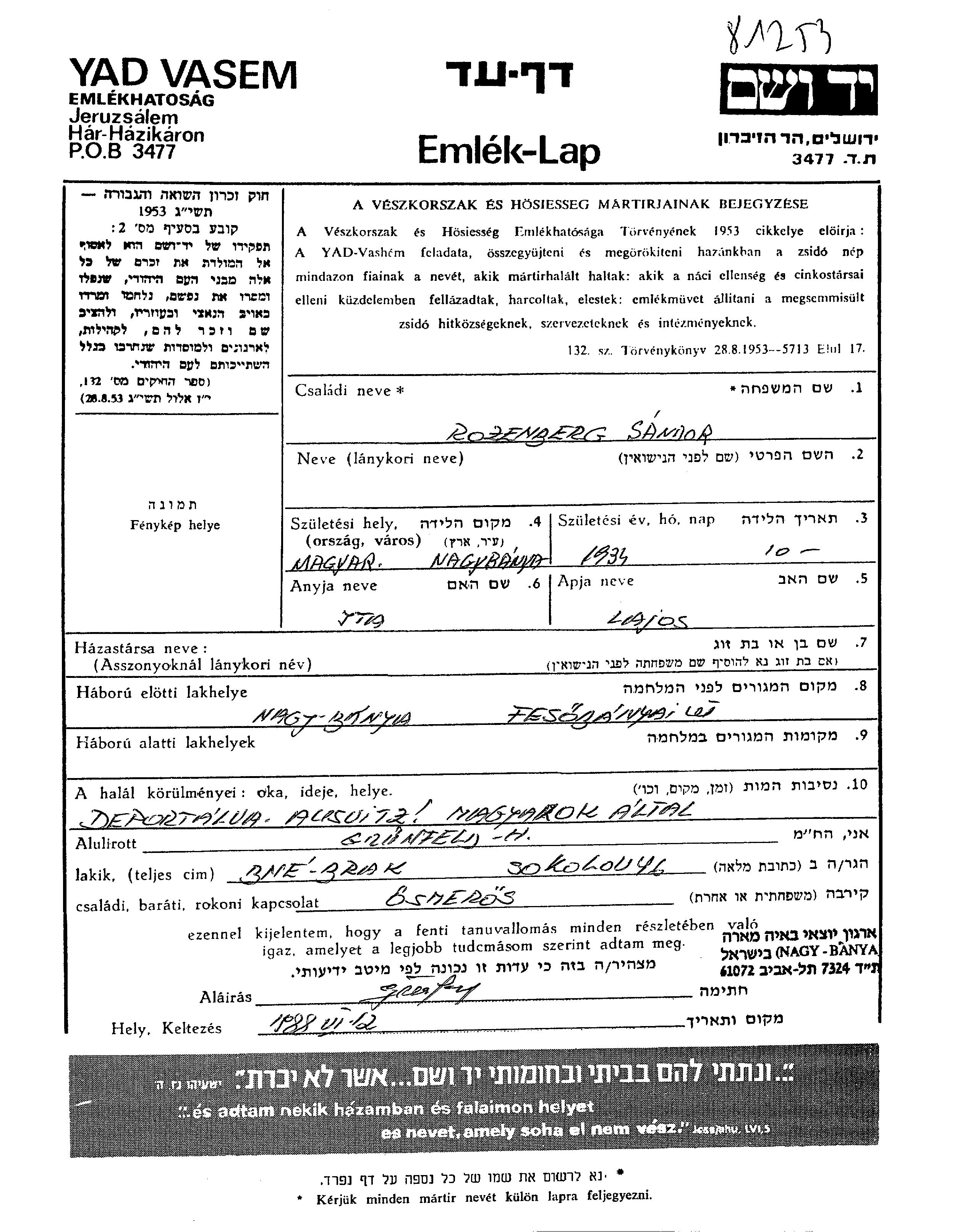 Sandor a été assassiné pendant la Shoah. Lieu de la mort: Auschwitz, Pologne en 1944.