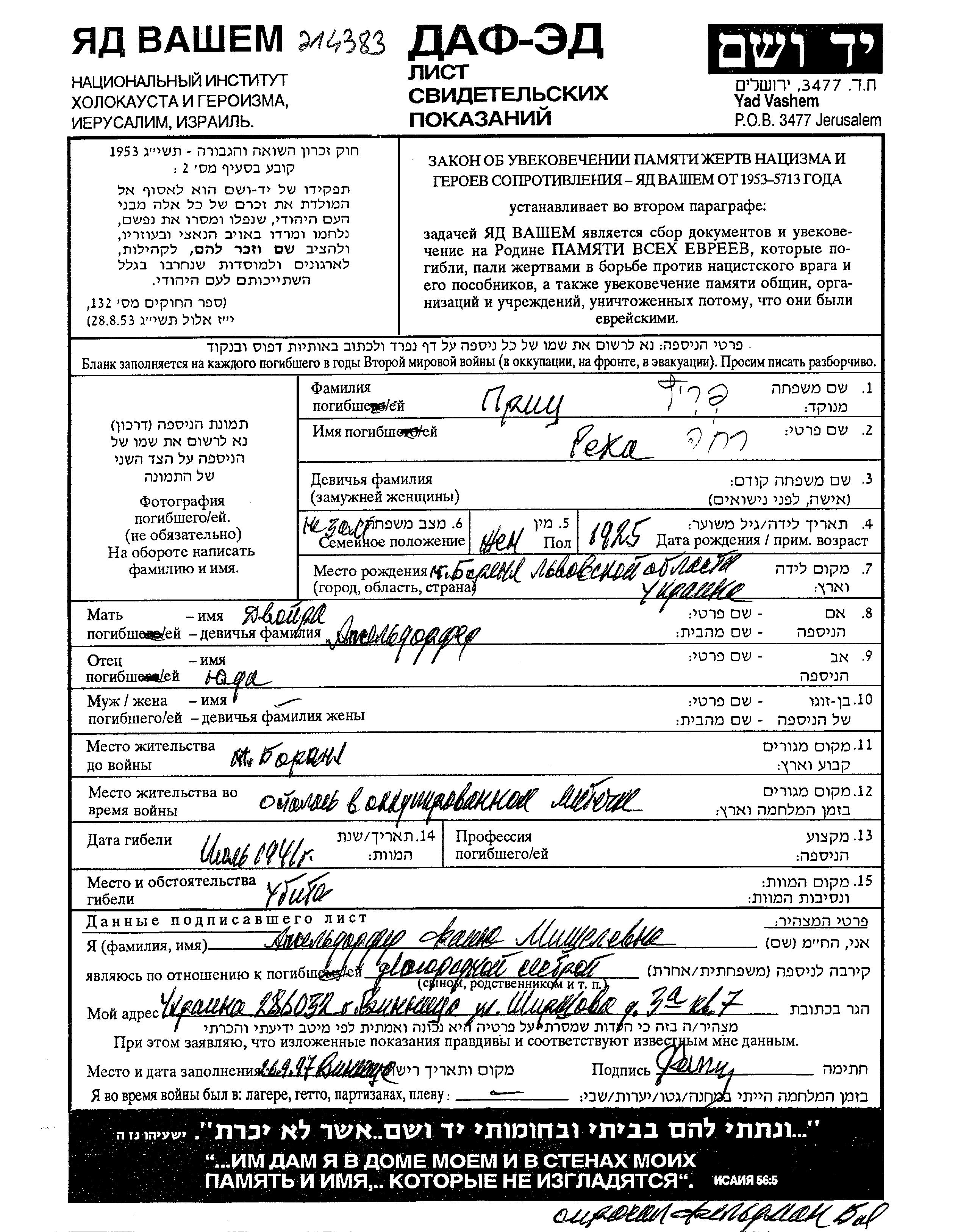 Yad Vashem - Pages of Testimony Names Memorial Collection