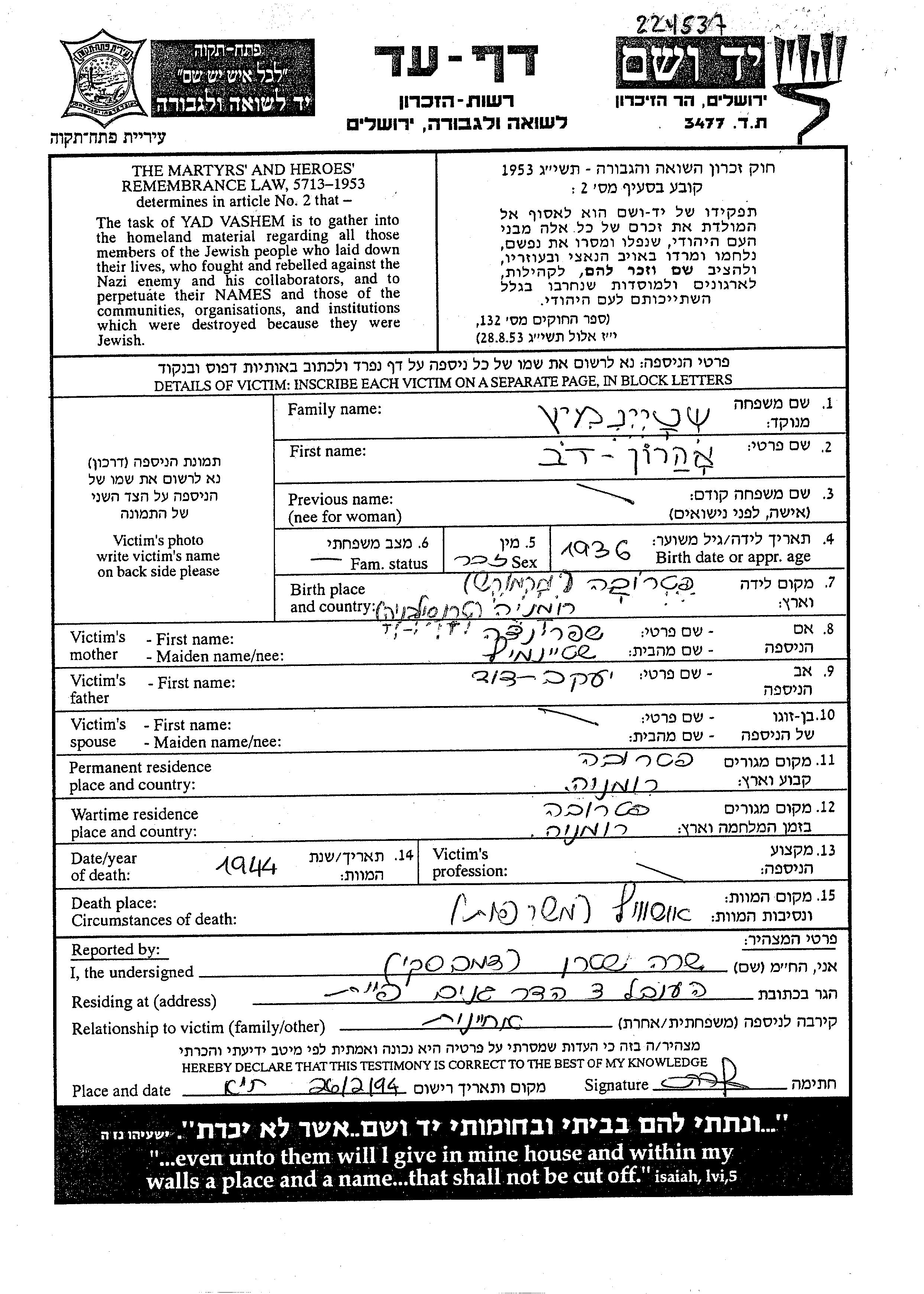 Shteinmetz Aharon Dov 1936 Petrova, Roumanie Feuille de témoignage