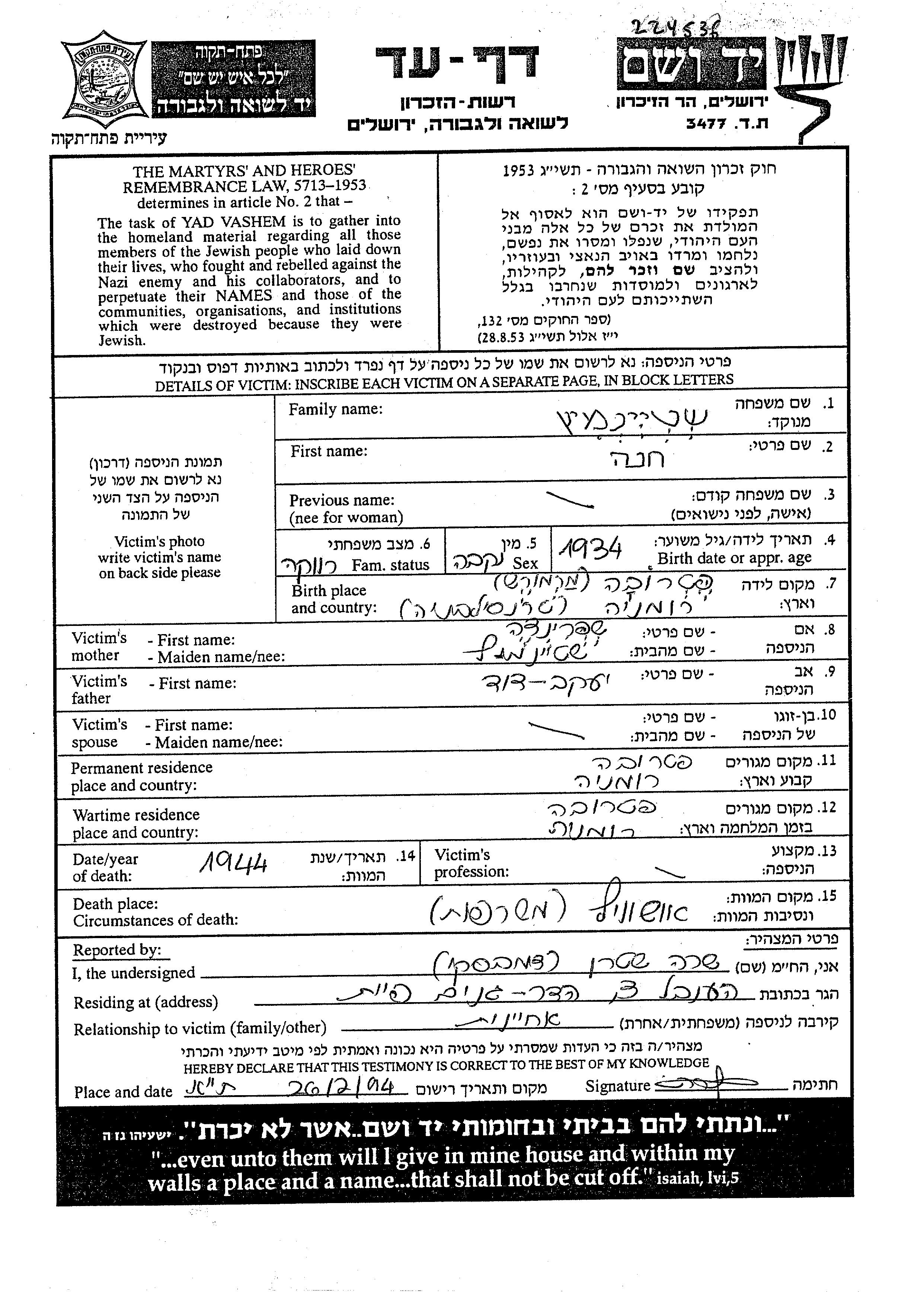 Shteinmetz Khana 1934 Petrova, Roumanie Feuille de témoignage