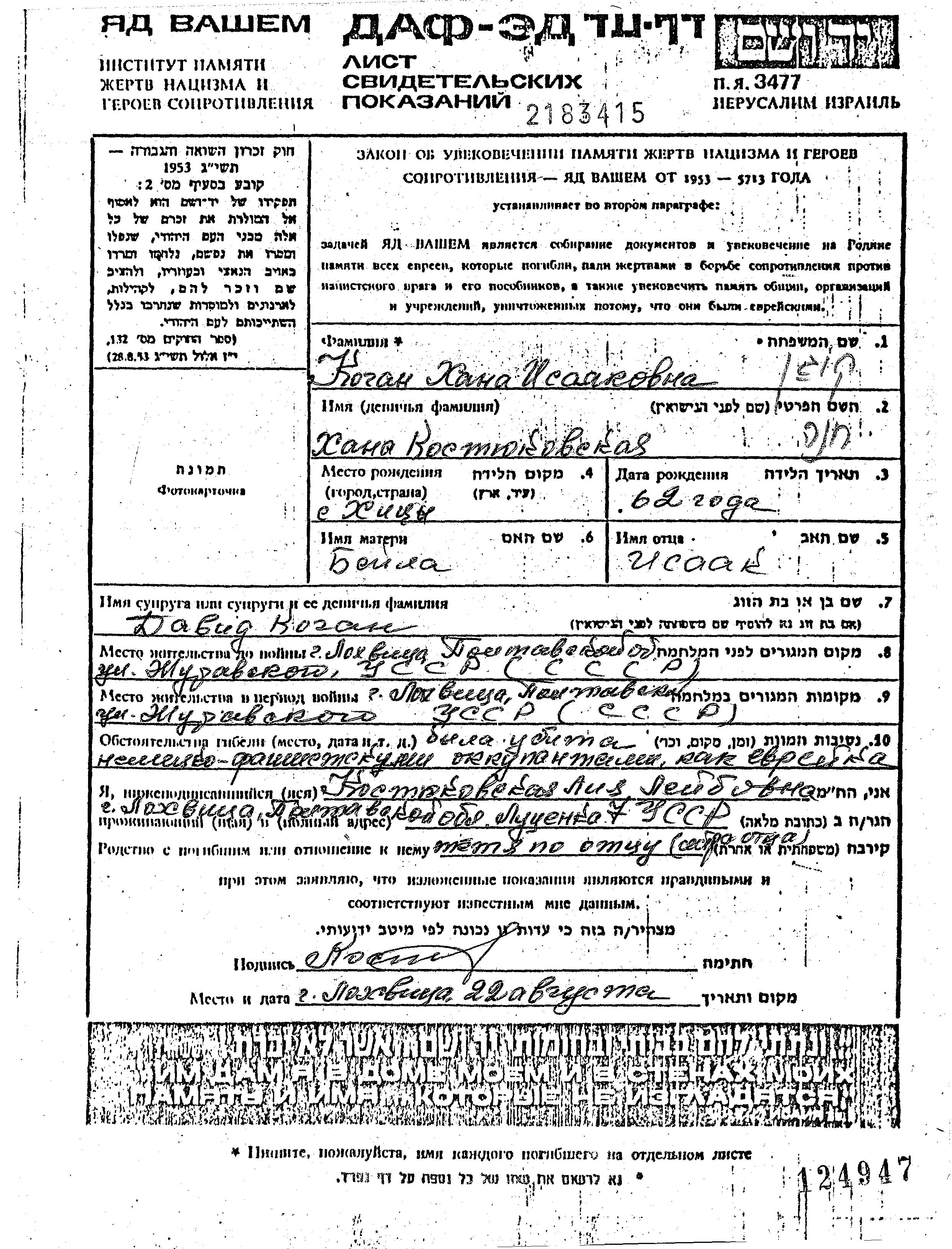 Kogan Khana Lokhvitsa, Ukraine (URSS) Feuille de témoignage