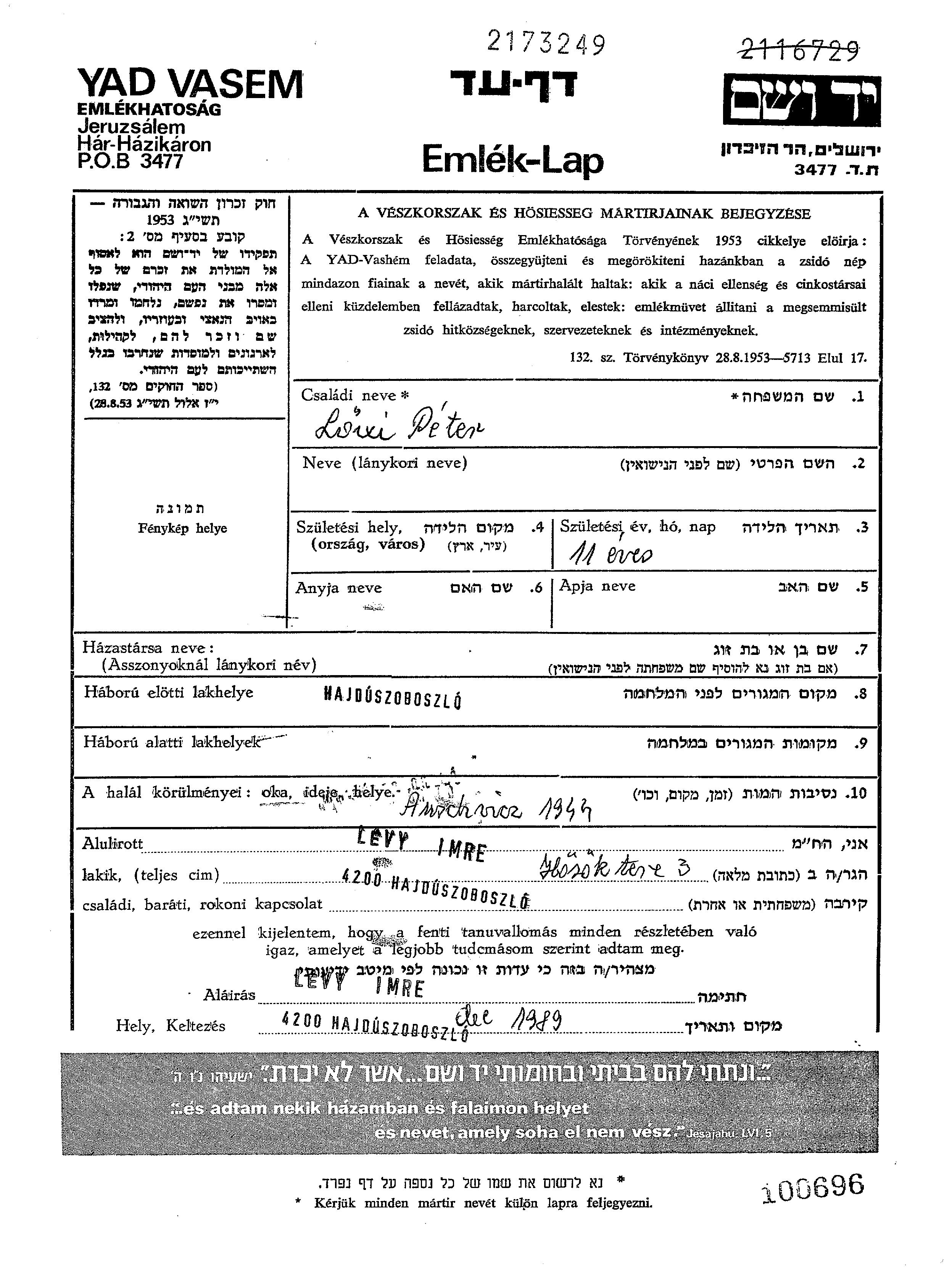 Loewi Peter Hajduszoboszlo, Hongrie Feuille de témoignage