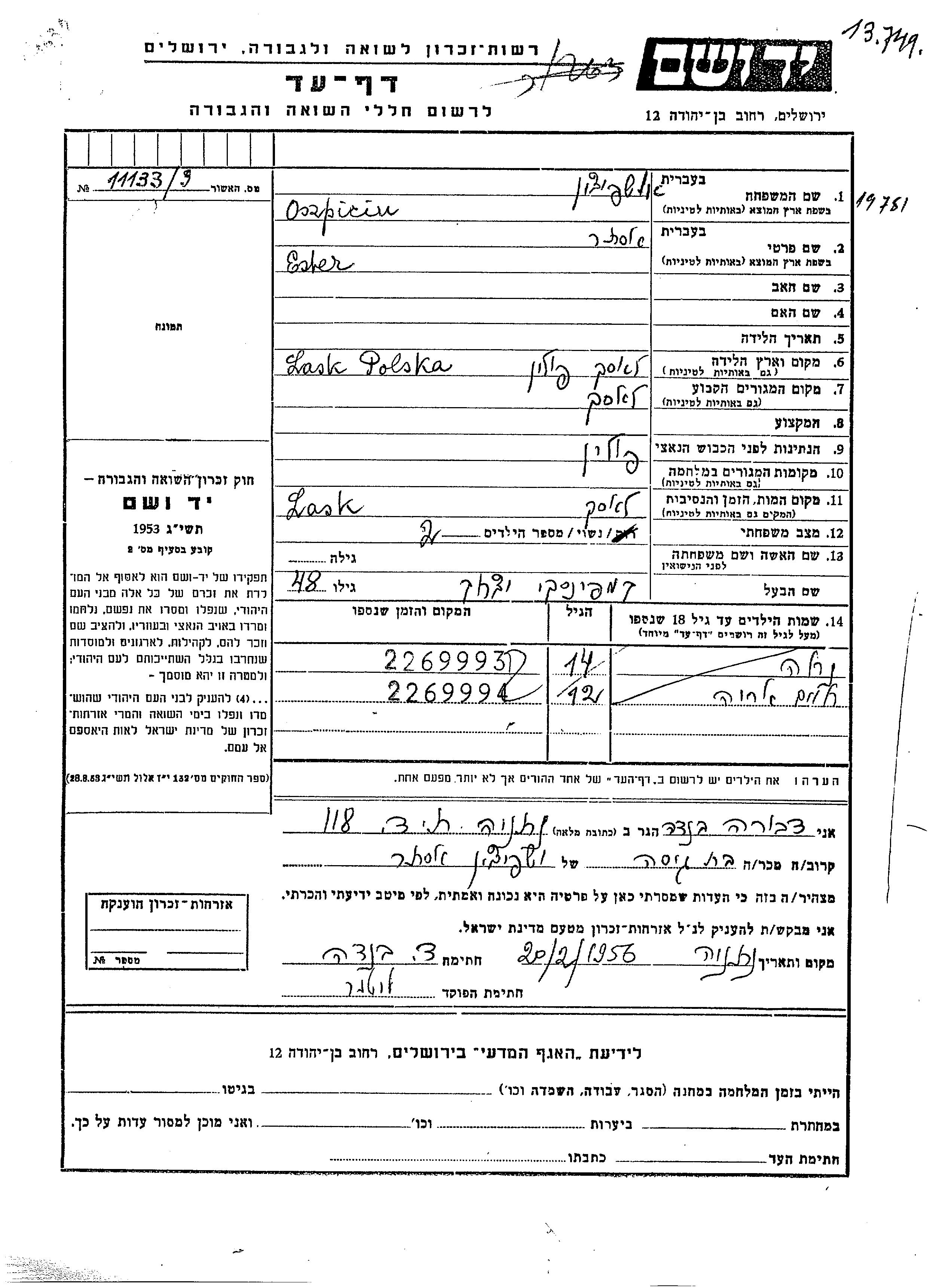 Oszpicin Nekha Lask, Pologne Feuille de témoignage