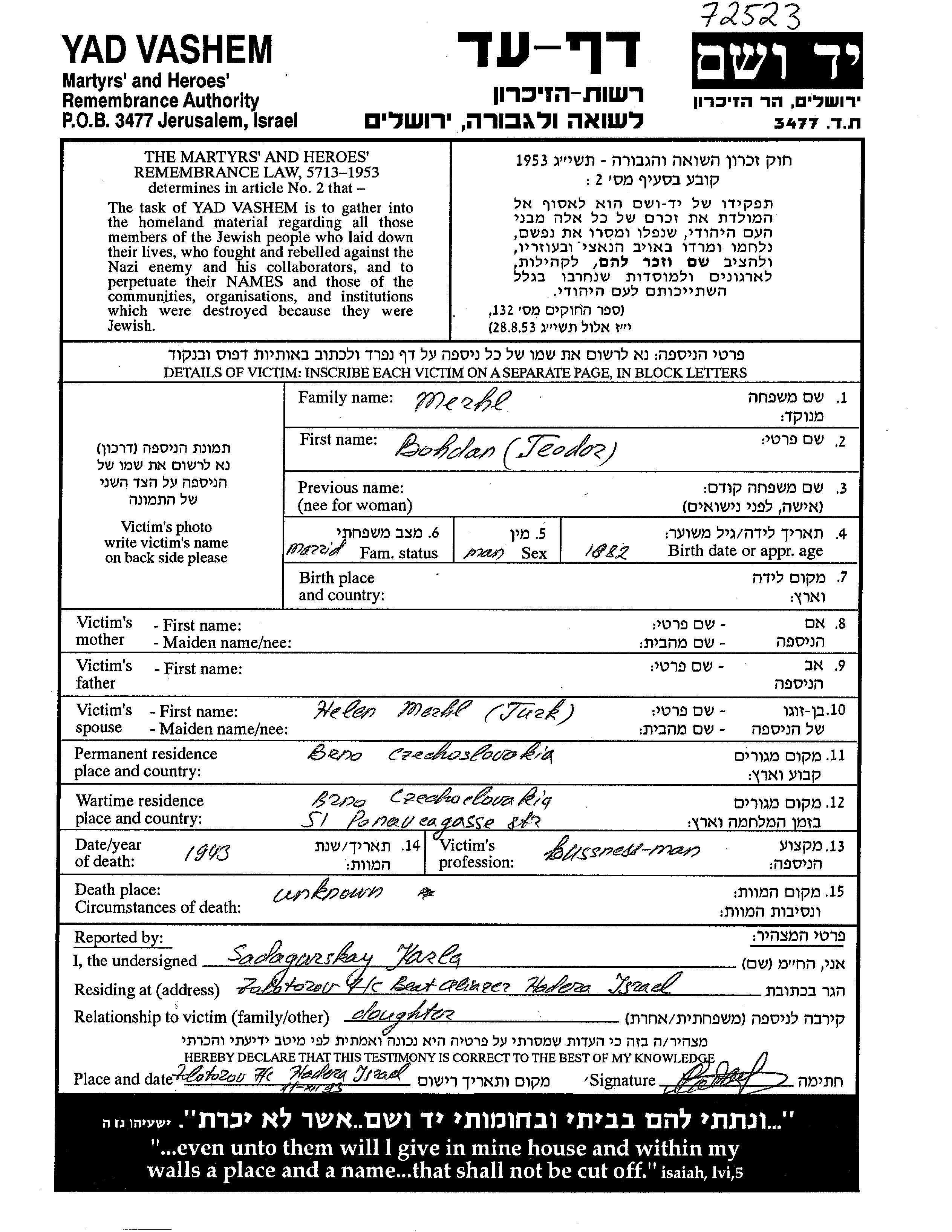 Bohdan Teodor Mehrl Marel est né en 1882. Il était Homme d'affaire et Mariée à Helen. Avant la seconde guerre mondiale il vivait à Brno, Tchécoslovaquie. Au cours de la guerre, il était à Brno, Tchécoslovaquie.