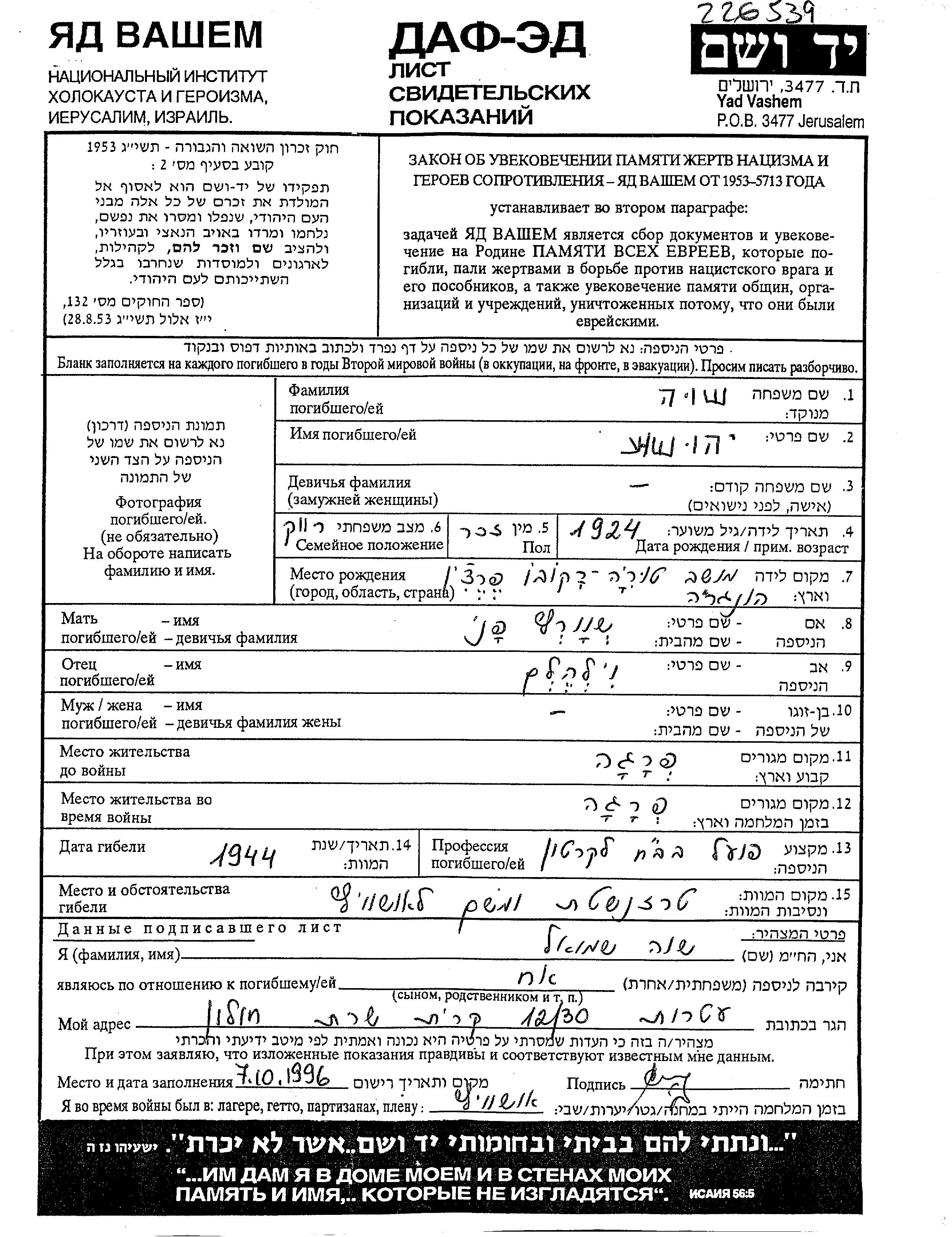 Yad Vashem - Pages of Testimony Names Memorial Collection