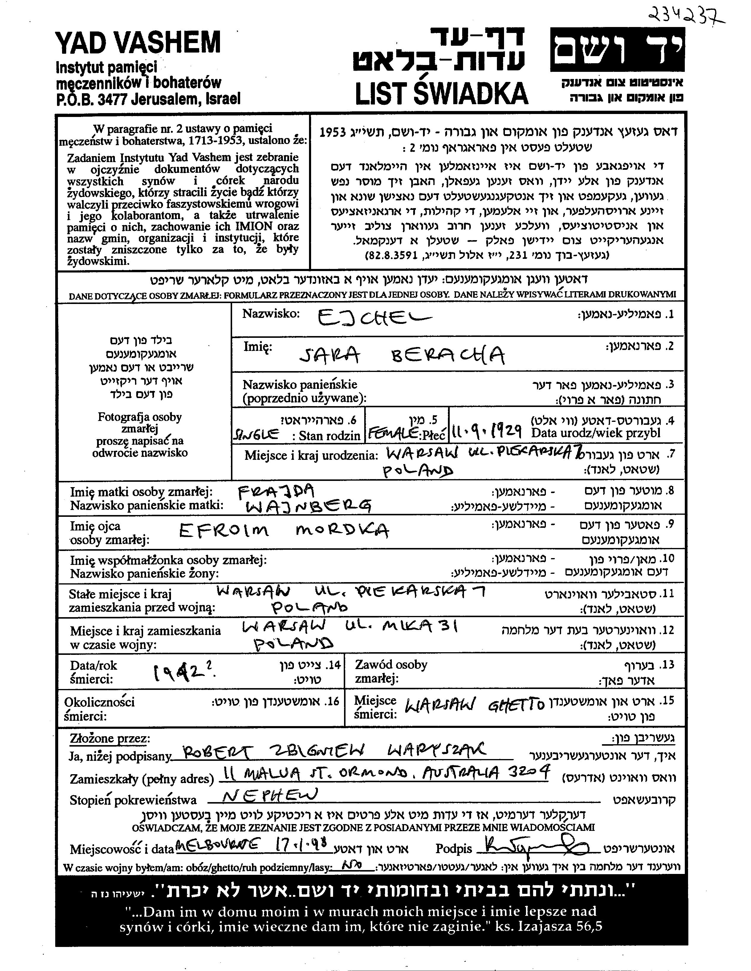 Ejchel Beracha Sara 1929 Warszawa, Pologne Feuille de témoignage