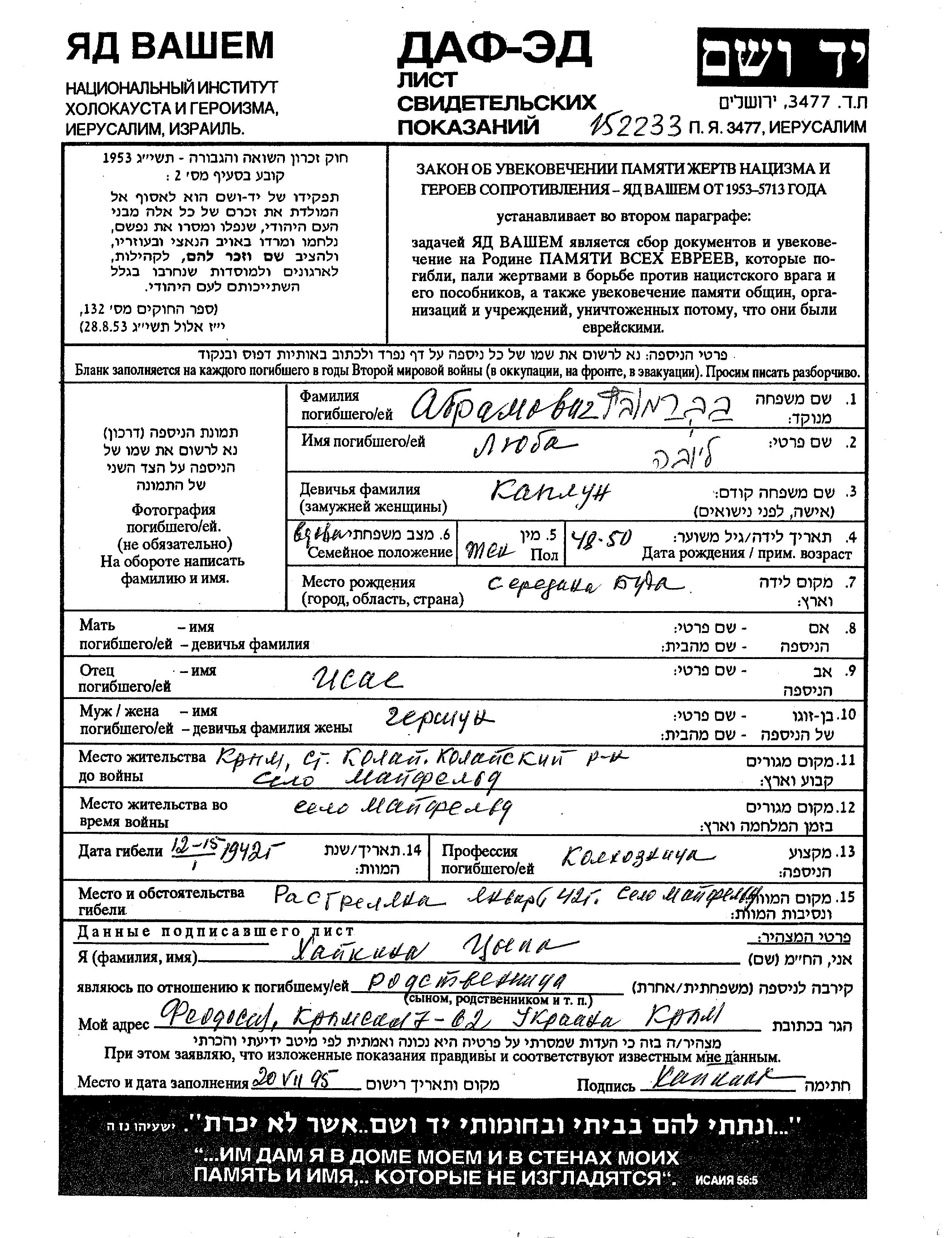 Abramovich Liuba 1893 Mayfeld, Russie (URSS) Feuille de témoignage