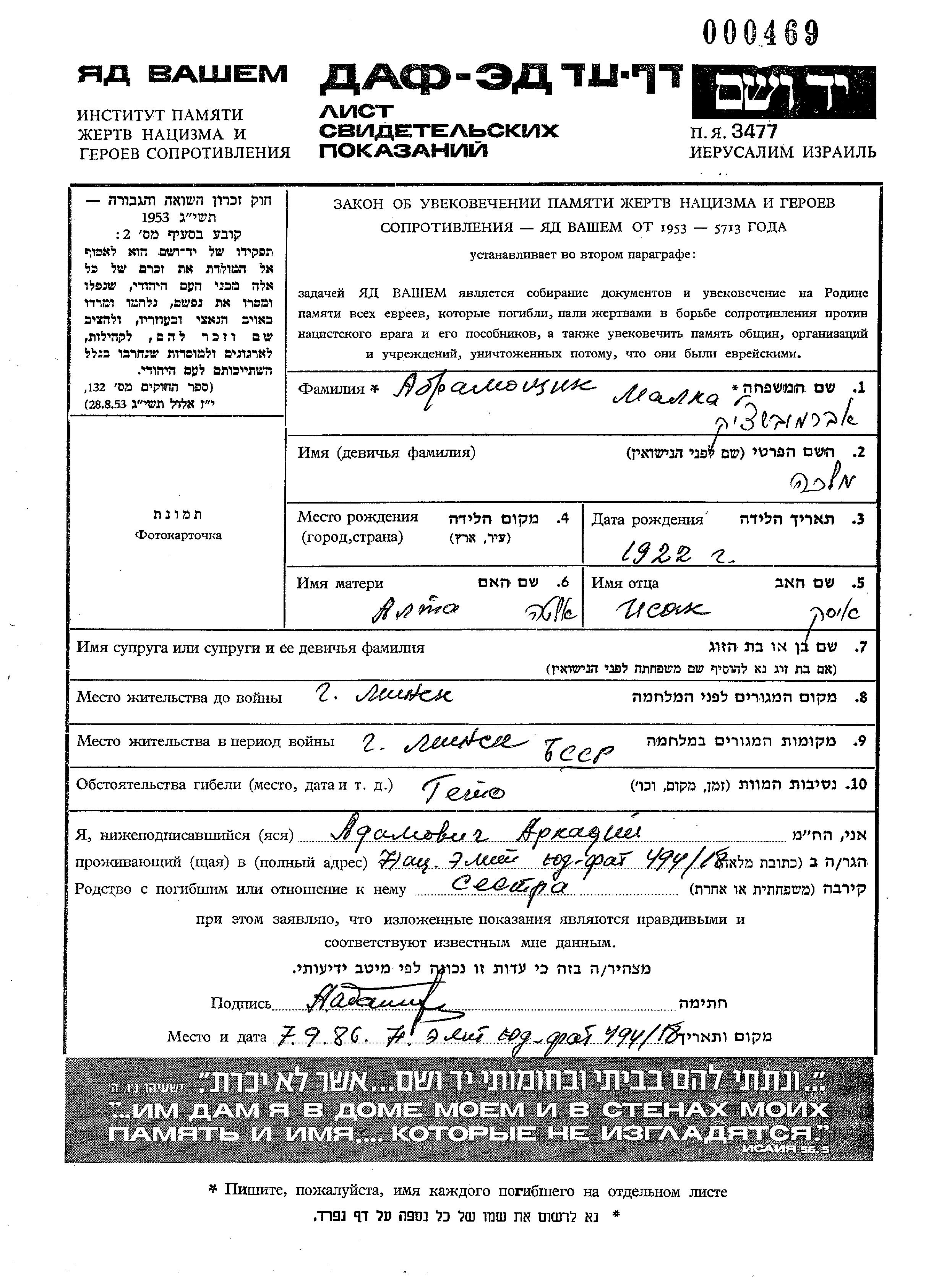 Abramovshchik Malka 1922 Minsk, Bélorussie (URSS) Feuille de témoignage