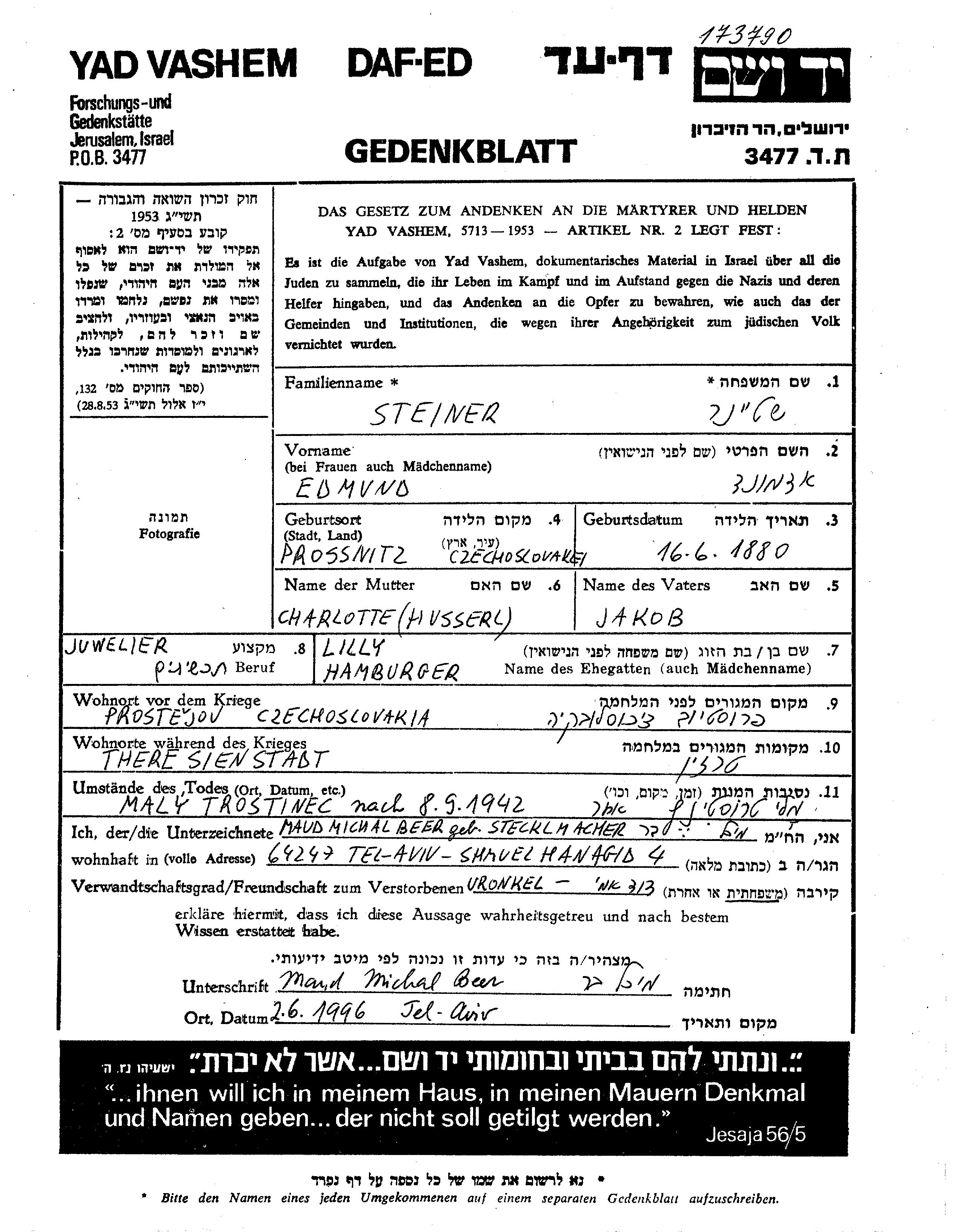 Edmund Steiner est né à Prossnitz, Tchécoslovaquie en 1880, fils de Jakob et de Charlotte née Husserl. Il était Orfèvre et Mariée à Lilly. Avant la seconde guerre mondiale il vivait à Prostejov, Tchécoslovaquie. Au cours de la guerre, il était à Tchécoslovaquie.