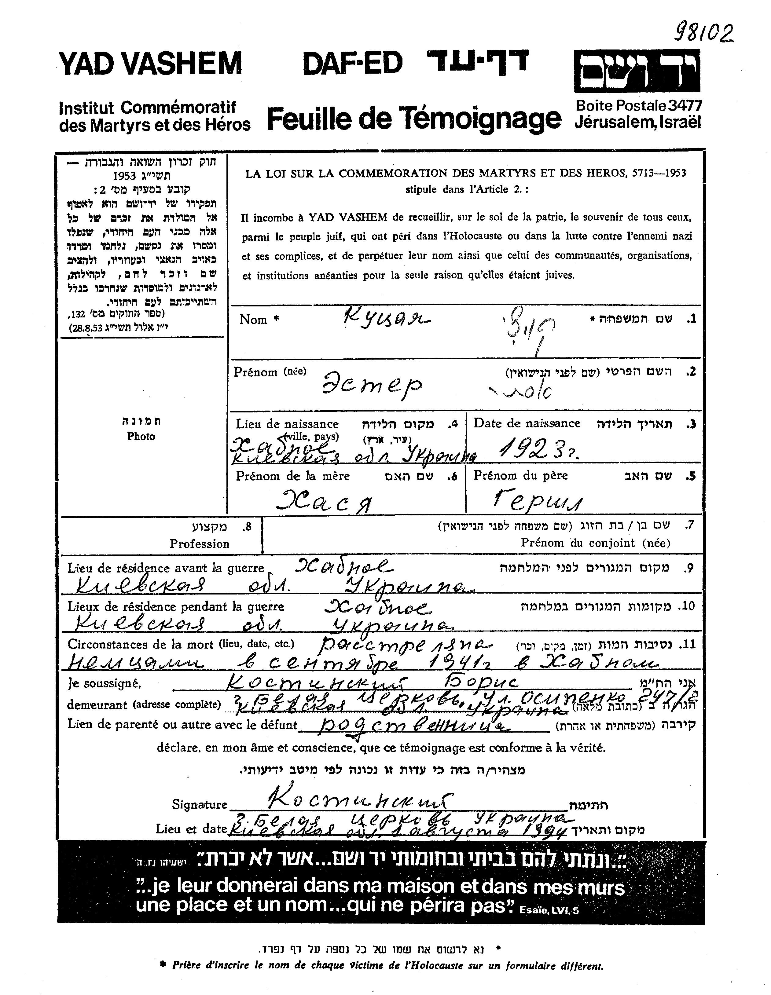 Kutzy Ester 1923 Khabne, Ukraine (URSS) Feuille de témoignage