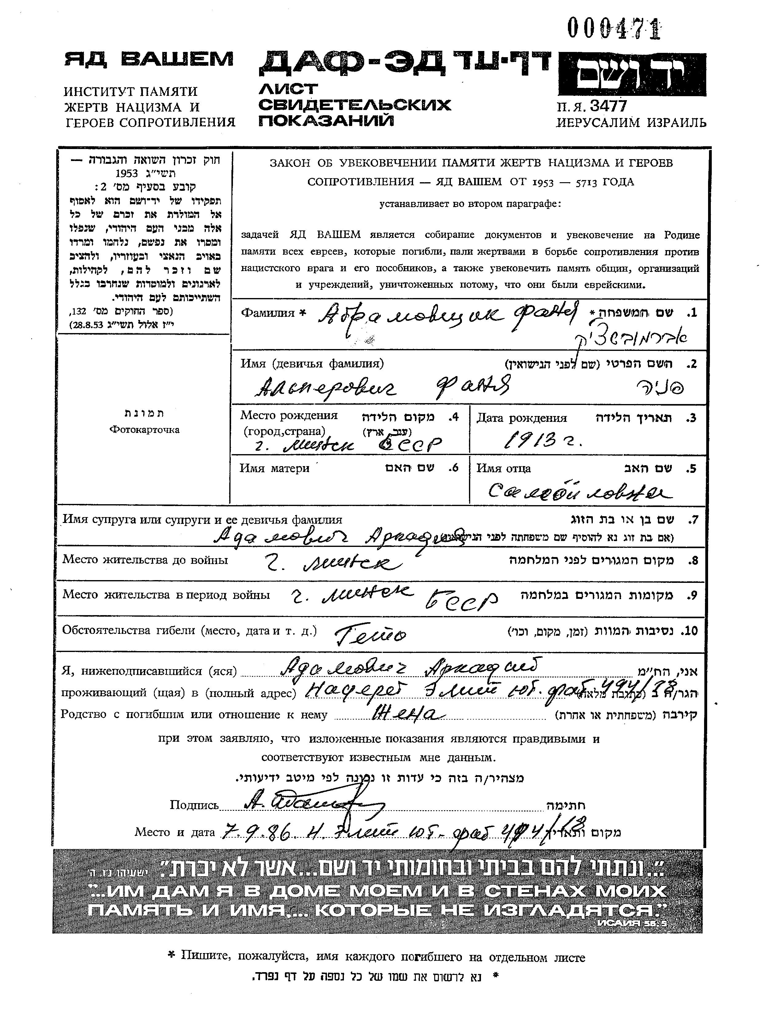 Abramovshchik Fania Frida 1913 Minsk, Bélorussie (URSS) Feuille de témoignage