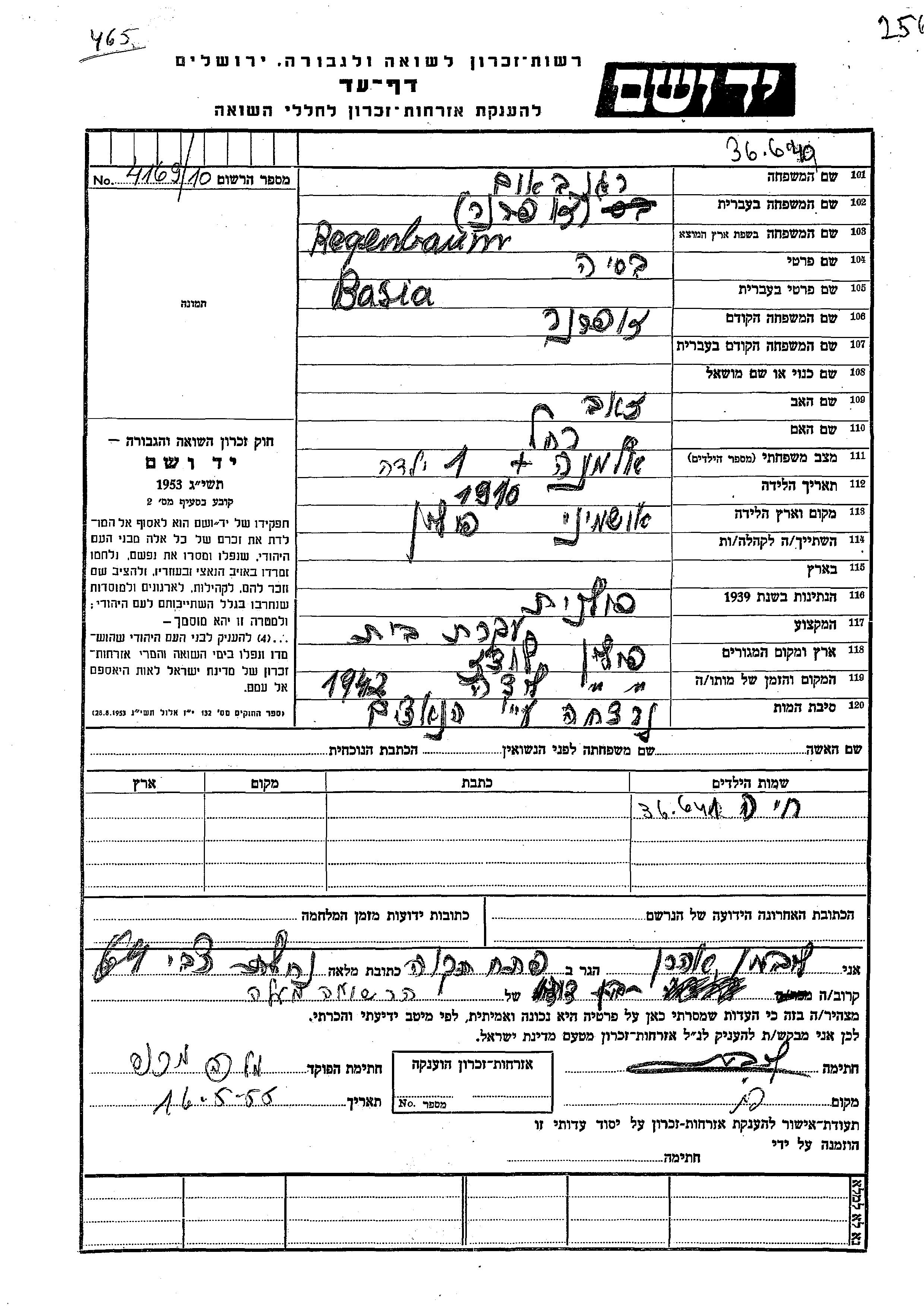 Regenbaum Basia 1910 Lodz, Pologne Feuille de témoignage
