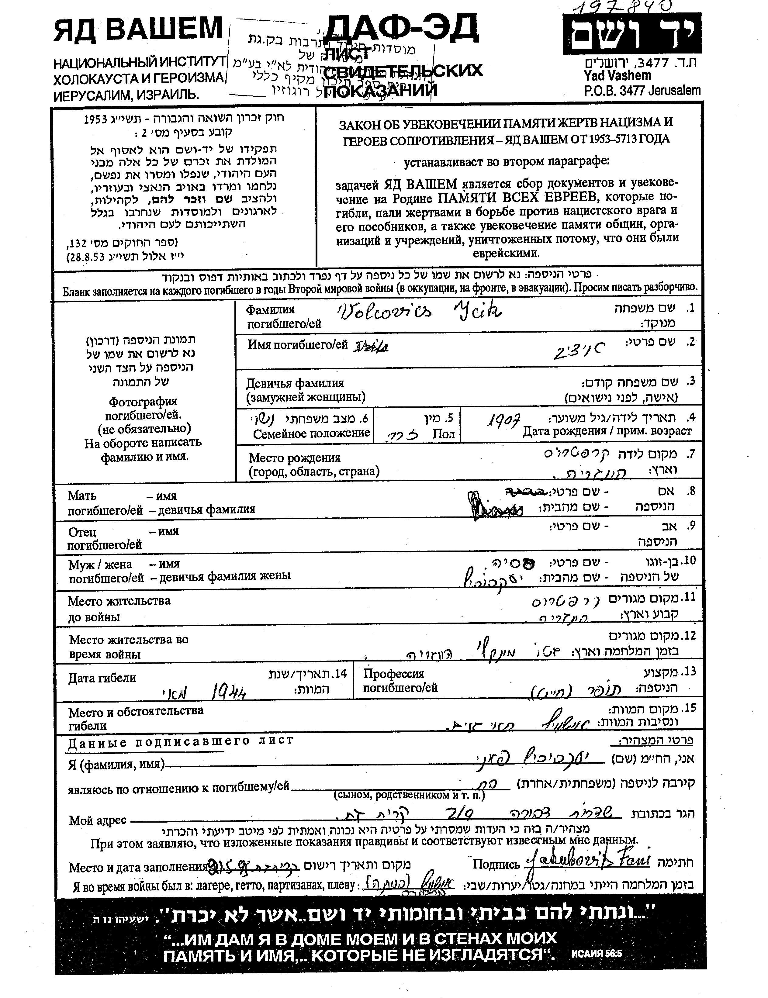 Volcovics Icik 1907 Zdenova, Tchécoslovaquie Feuille de témoignage