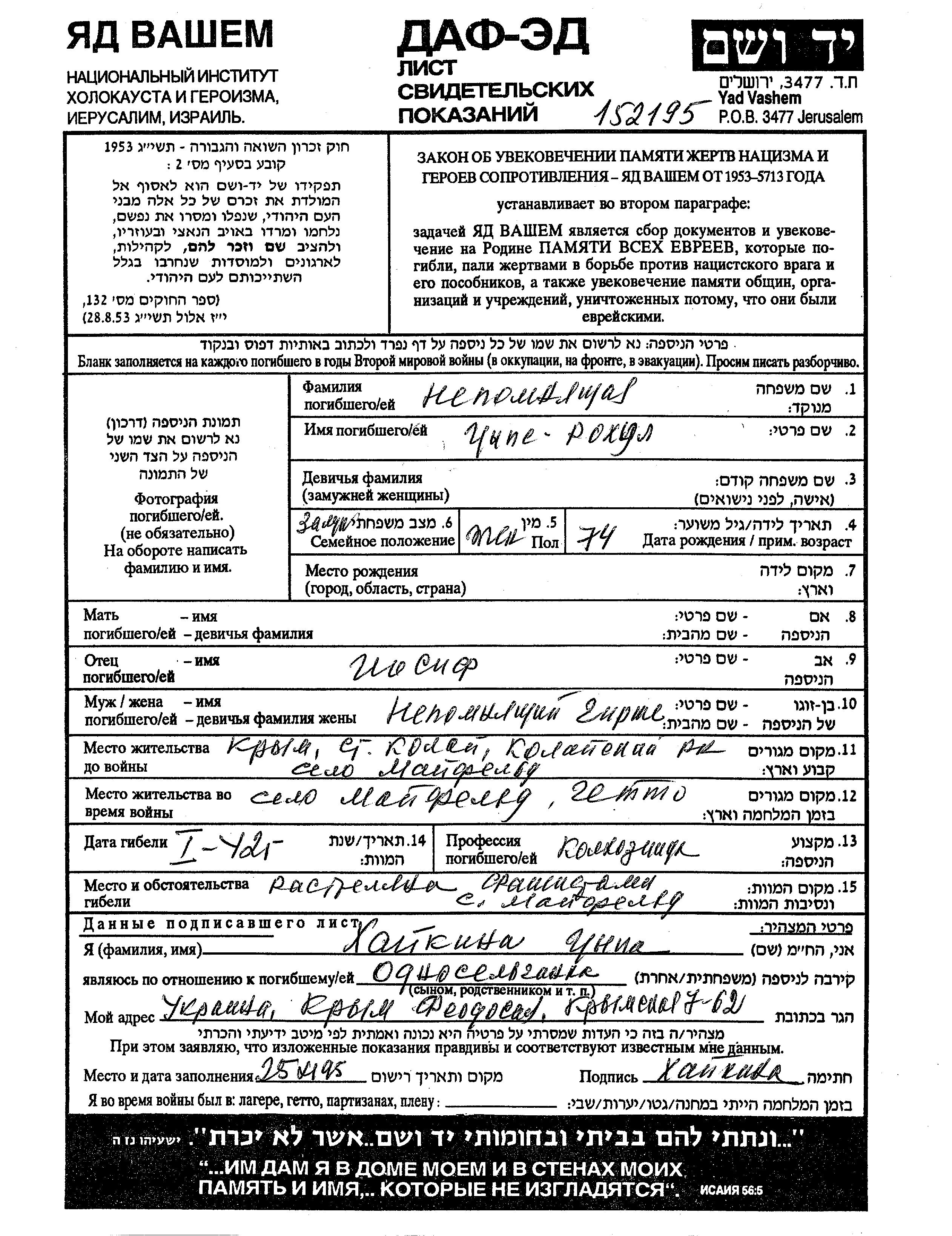 Yad Vashem - Pages of Testimony Names Memorial Collection