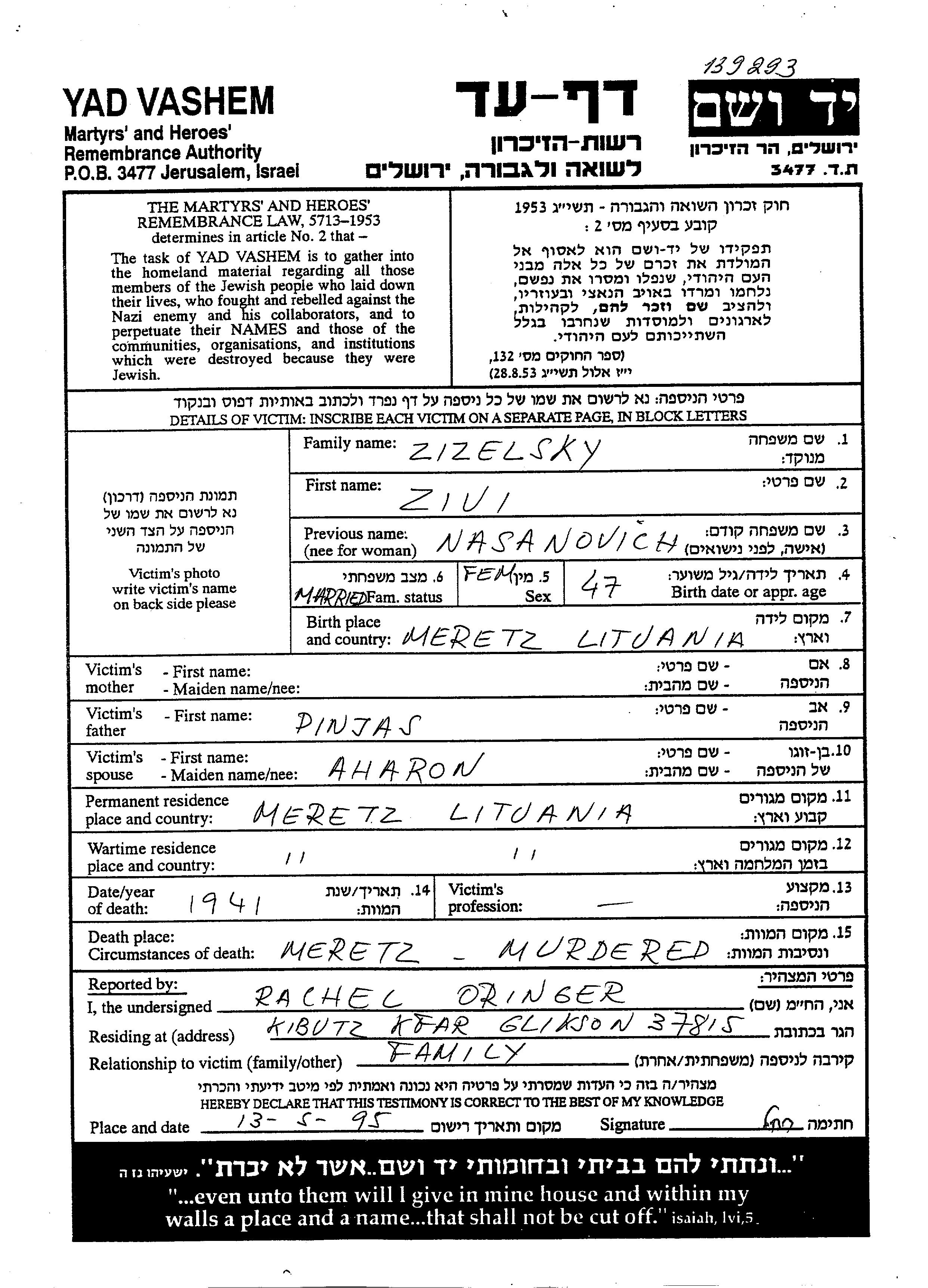 Zivi Tzvia Zizelsky née Nasanovich est née à Merch, Lituanie en 1894, fille de Pinjas. Elle était Mariée à Aharon. Avant la seconde guerre mondiale elle vivait à Merch, Lituanie. Pendant la guerre, elle était à Merch, Lituanie.