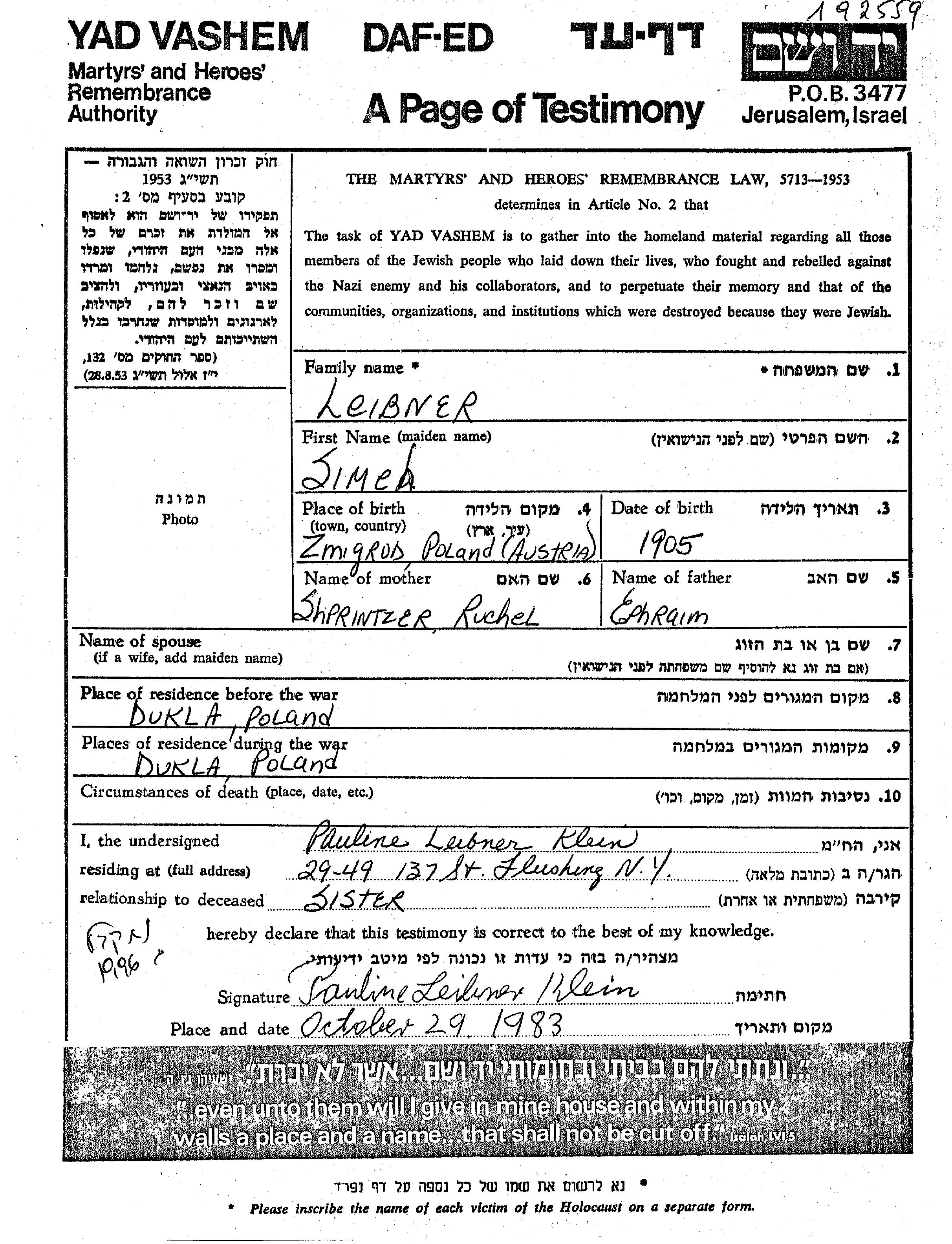 Leibner Simeh 1905 Dukla, Pologne Feuille de témoignage