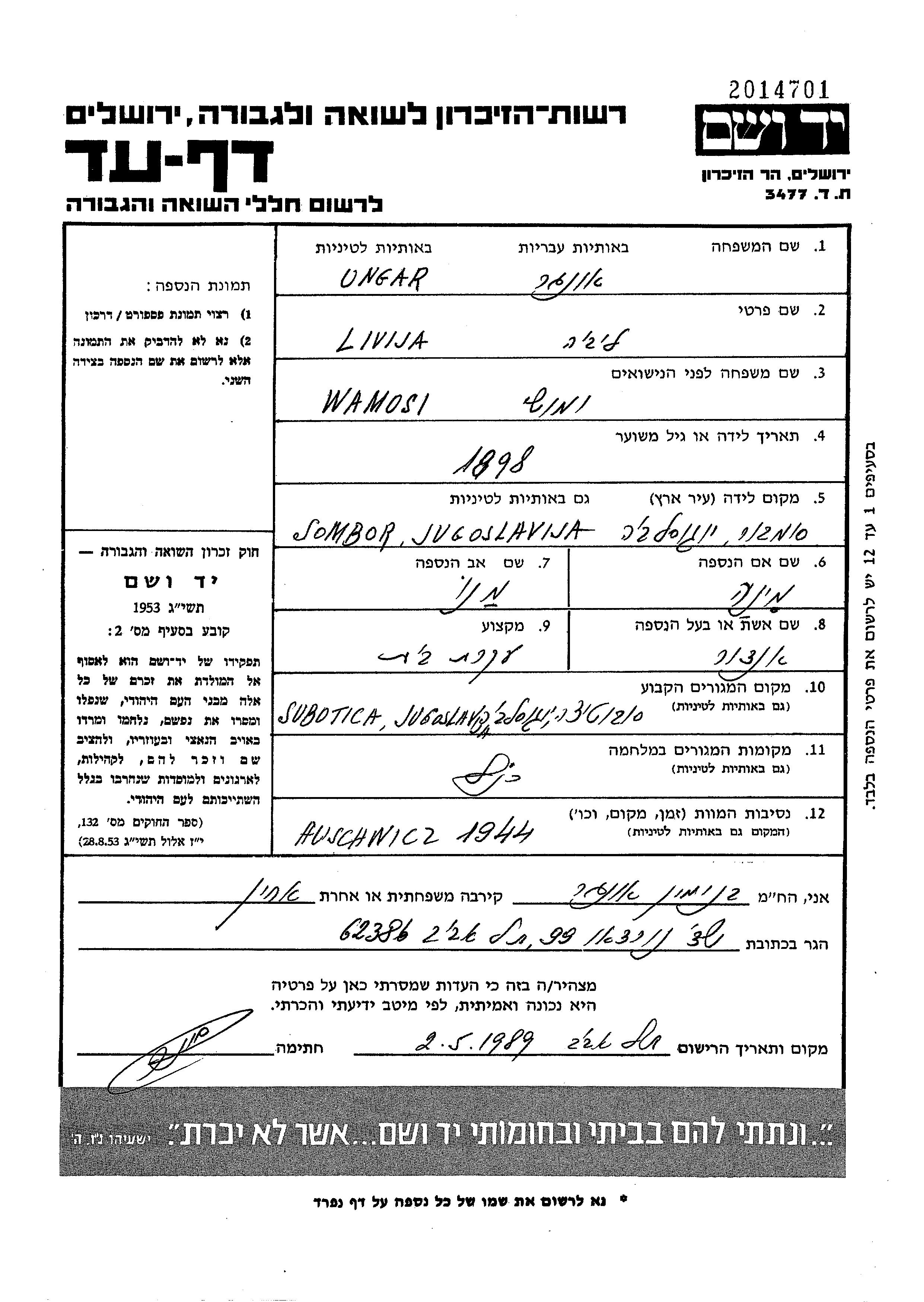 Livija Ungar née Wamosi est née à Sombor, Yugoslavie en 1898, fille de Emanuel et de Mina. Elle était Femme au foyer et Mariée à Andor. Avant la seconde guerre mondiale elle vivait à Subotica, Yugoslavie. Pendant la guerre, elle était à Subotica, Yugoslavie.
