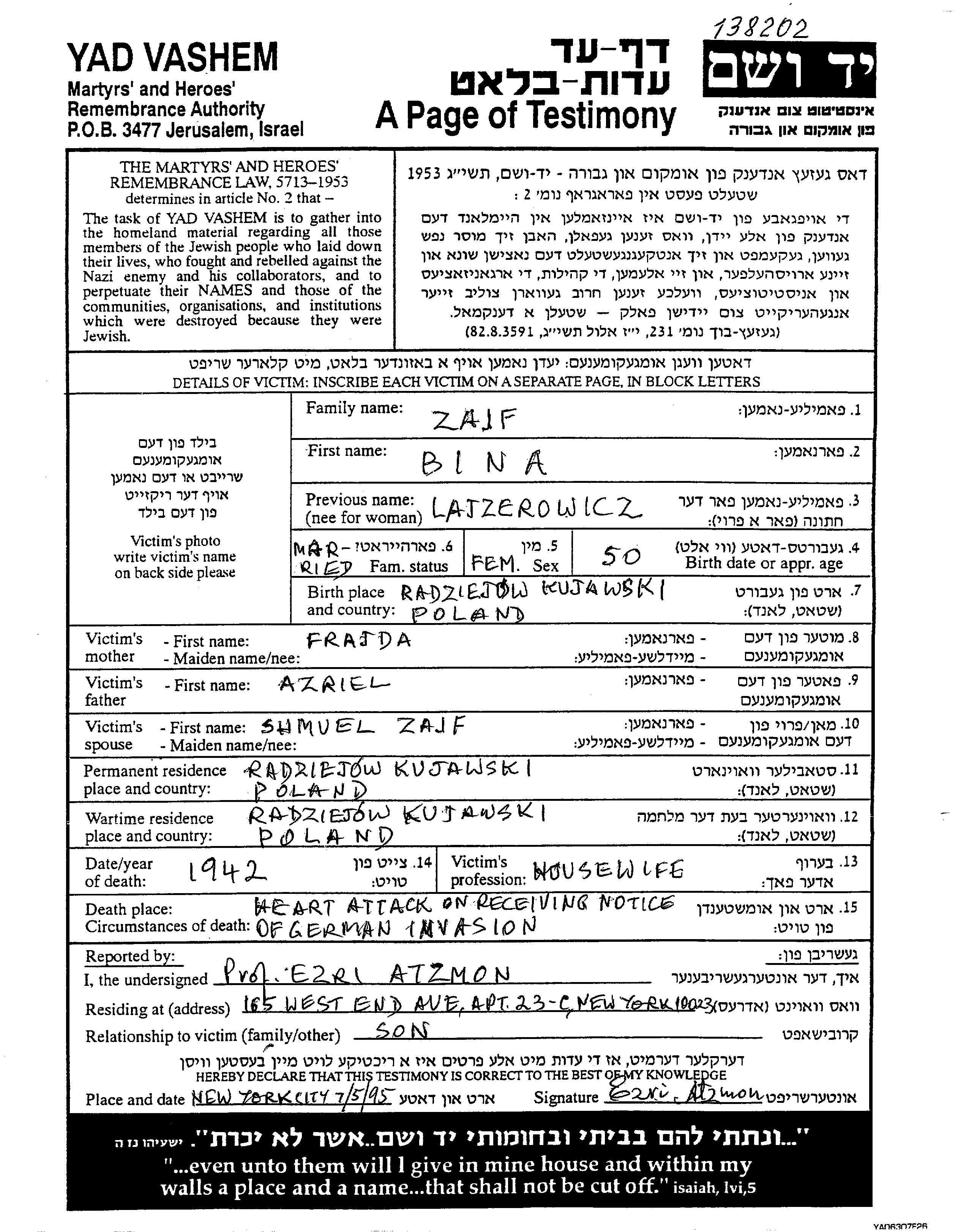 Zajf Bina 1892 Radziejow, Pologne Feuille de témoignage