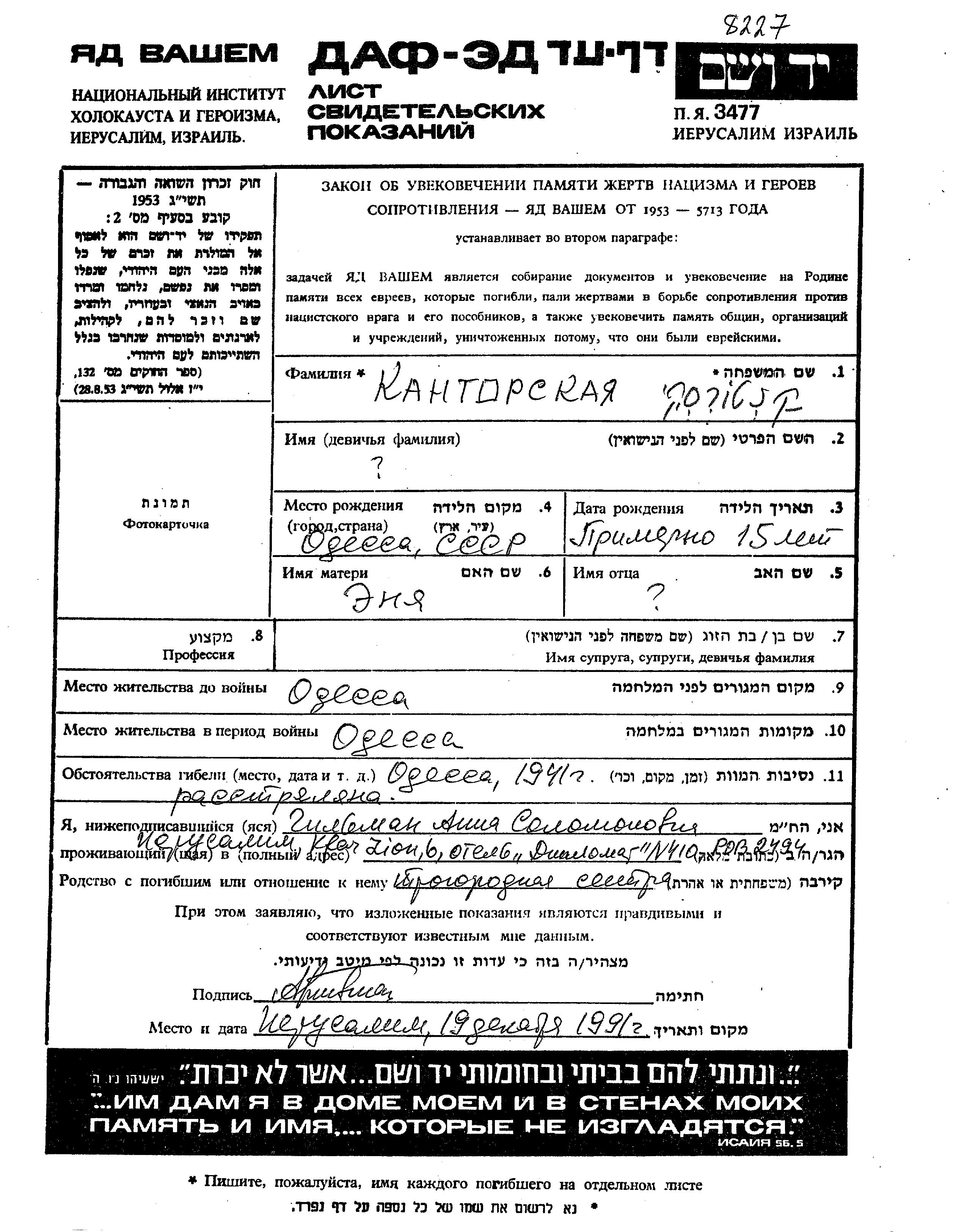 Kantorski prénom inconnu Odessa, Ukraine (URSS) Feuille de témoignage