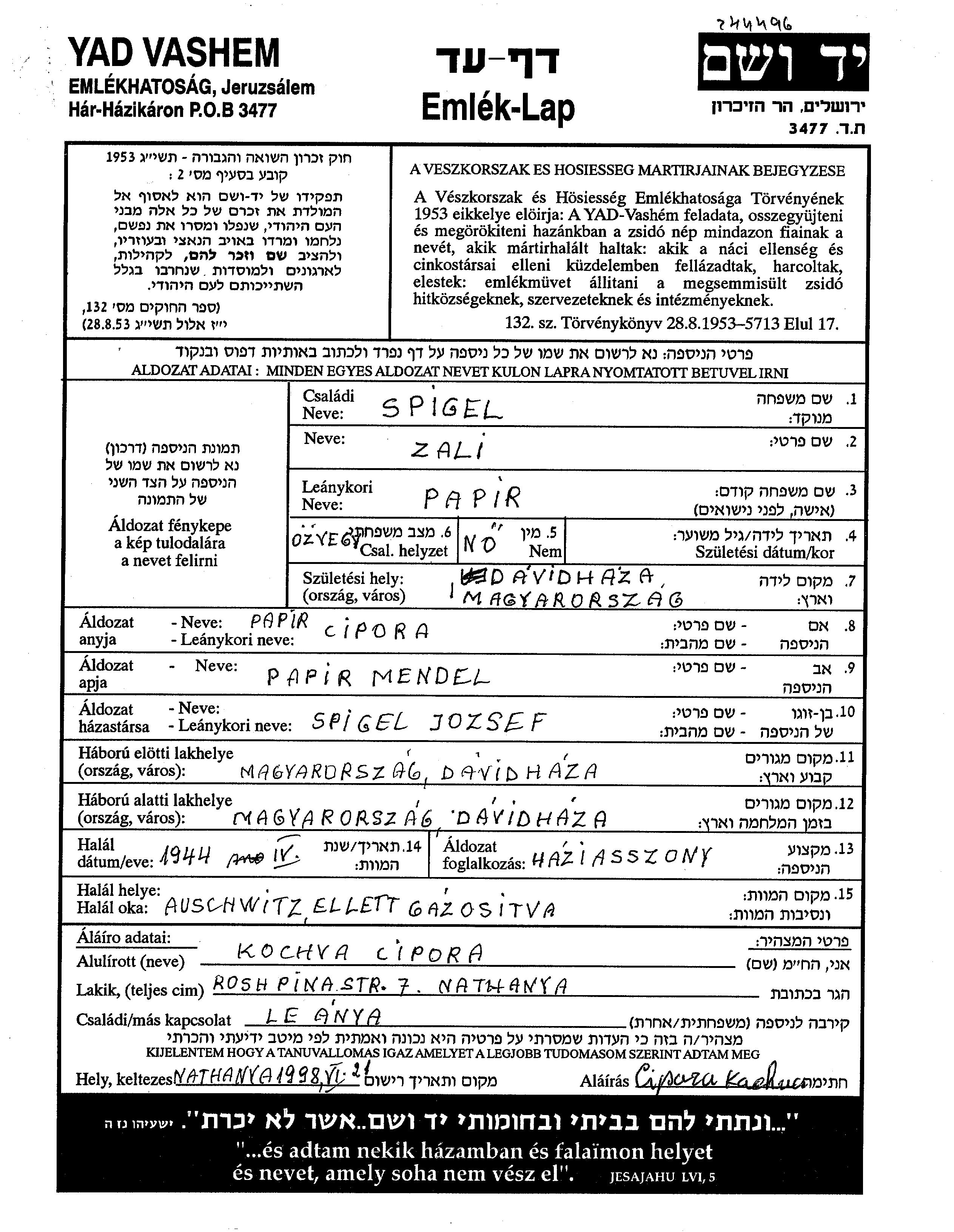 Spigel Zali Davidhaza, Hongrie Feuille de témoignage