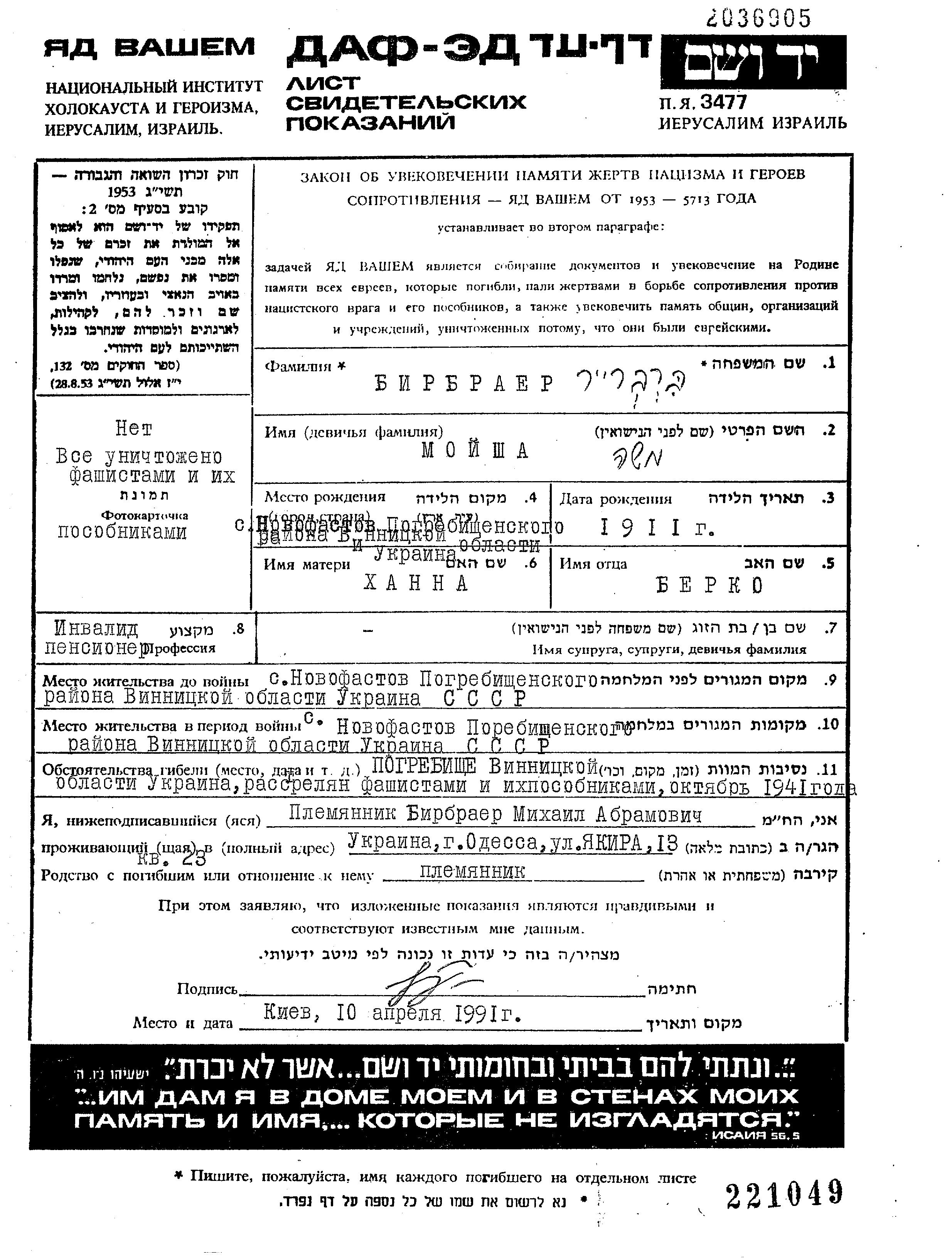Birbrayer Moishe 1911 Novofastov, Ukraine (URSS) Feuille de témoignage